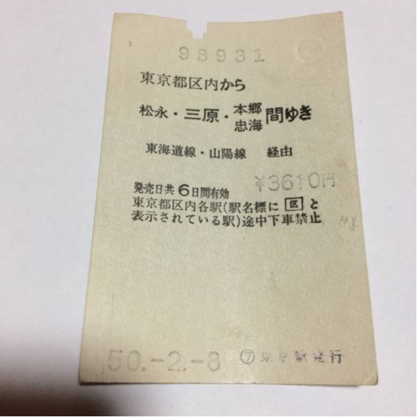 3)98931 東京都区内から松永・三原・本郷忠海間ゆき 東海道線・山陽線 経由 \3610円 発売日共6日間有効 東京都区内各駅(駅名標に区と表示されている駅)途中下車禁止 50.-2.-8 ⑦東京駅発行