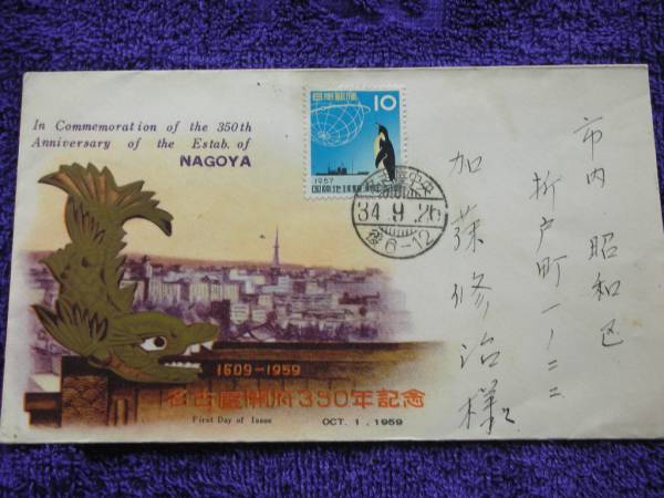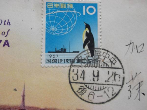 エンタイア 南極観測10円貼り 櫛形印 34.9.26 名古屋中央