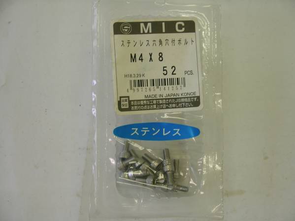 コノエ MIC ステンレス製6角穴付ボルト M4X8 15本入り。袋破れ有りです。