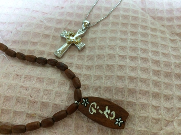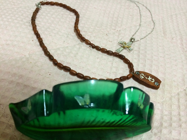 とても素敵なPIKOブランドの木製ネックレス、クリスタルガラス入コンビハート&クルスのペンダント付きネックレス、バナナの葉型(長さ約10cm・樹脂製)皿となります!皿以外は未使用のお品です!