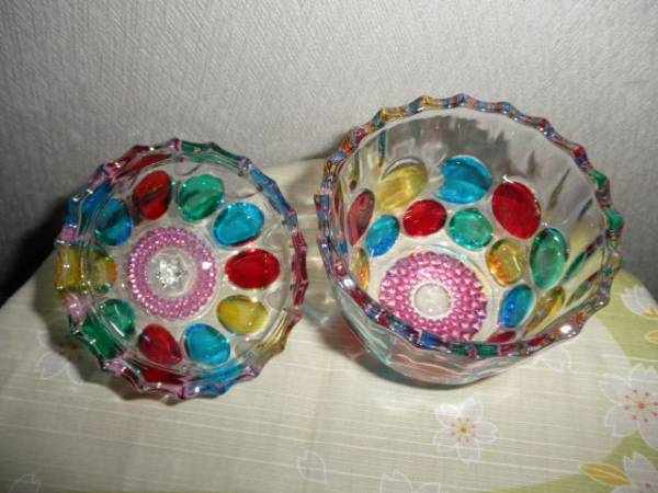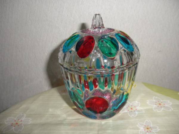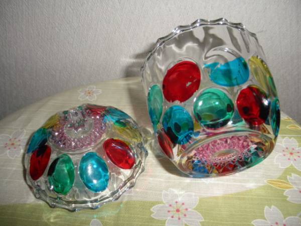 | ステンドガラス調のキャンディ入れです。 色とりどりの水玉模様が、かわいらしくてきれいです。 小物入れとしてもつかえますよ。 とことどころ色がきれいについていない色落ち部分が見られます。 中古品をご理解の上ご入札をお願いいたします。 サイズ 口径8.5cm 高さ11.8cm ♪一度は人のお手に渡ったお品になりますので、神経質なお方・些細な事が気になるお方、 または、新品をお求めのお方は、ご入札をお控えください。 ♪出品時、十分確認はいたしておりますが、稀にキズなど見落し がある場合がございます。中古品をご理解の上、ノークレームノーリターンでお願いいたします。 ―――――――――――――――――――――――――――――――――― 画像に写しきれないキズや色の剥れた部分、見落とし等あるかもしれませんが、ご理解の上入札をお願いします。 ーーーーーーーーーーーーーーーーーーーーーーーーーーーーーーーーーーーーーーーーーーー | |||