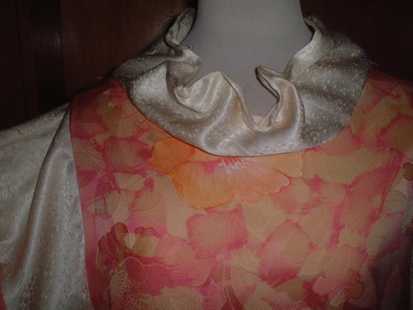 綸子の訪問着と白綸子の付下げから立体衿七分袖ワンピースにリメイク致しました。
