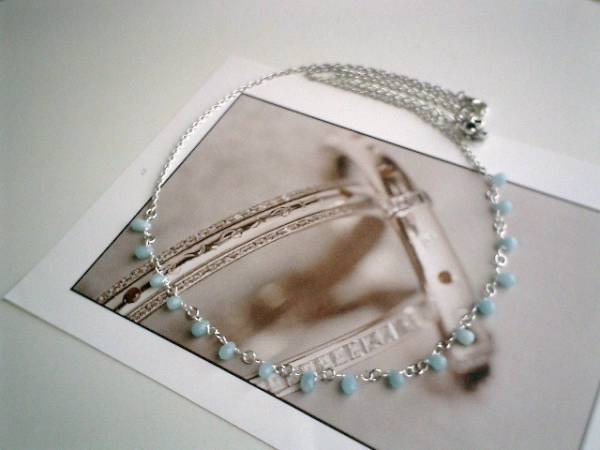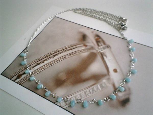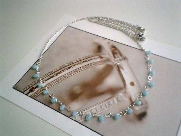 仏蘭西物語・・シリーズです♪ミッシェルの水色・・可憐なアマゾナイトのネックレスです♪小さなドロップカットのアマゾナイトが儚げな表情です♪7×5ミリ位の小さなドロップカットのアマゾナイトはランダムに繋いで可憐な表情です♪長さは55センチ+アジャスター12センチで最長67センチ位です♪お揃いのネックレスやブレスレットも出品しています♪♪シンプルで飽きのこないいつまでも着けられるデザインを考えて作りました!ハンドメイドをご理解頂いてノークレーム、ノーリターンでお願いします