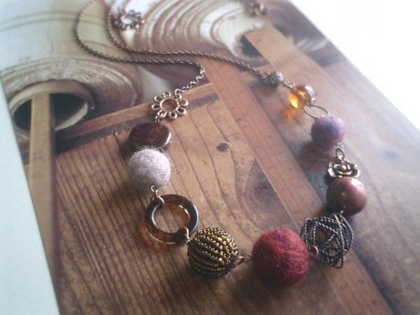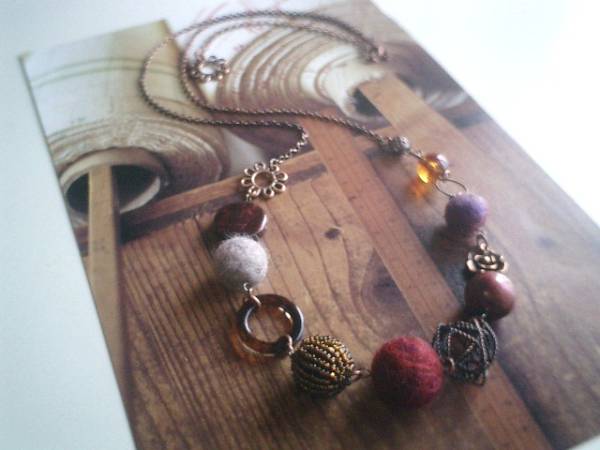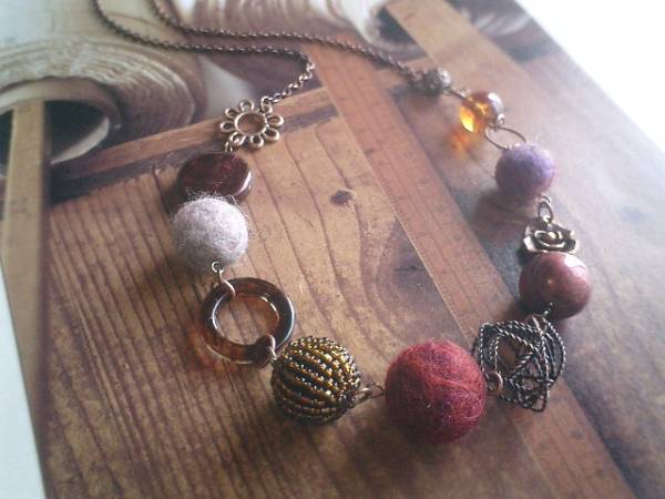秋色スタイル・・シリーズです♪シックな異素材・・秋色のボルドーや煉瓦色やブラウン、パープルのフェルト玉やビーズボール、編みボールや樹脂リングに薔薇のメタルビーズやワイヤーボールを合わせてロマンチックなネックレスです♪10ミリから22ミリ位までの大きさ違い、デザイン違いの異素材がアンティークな表情です♪長さは80センチ+アジャスター14センチで最長94センチ位です♪お揃いのブレスレットも出品しています♪ハンドメイドをご理解頂いてノークレーム、ノーリターンでお願いします