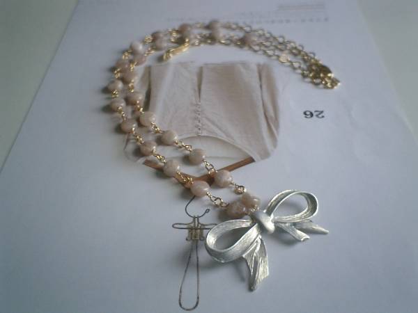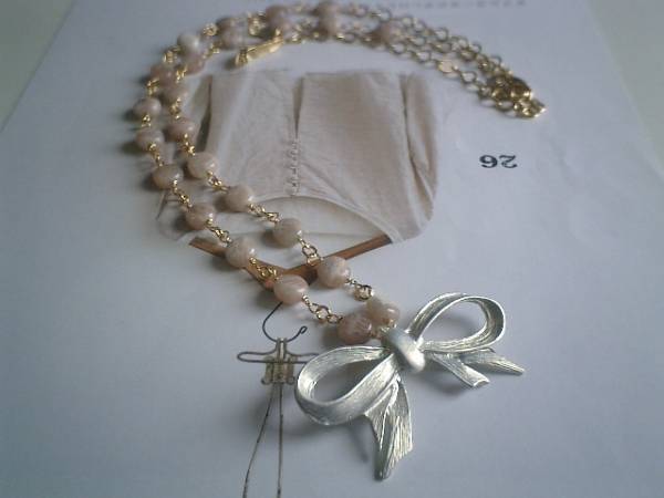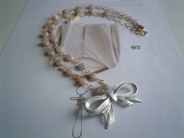 エゴイスト・少女・・シリーズです♪大人色のリボン・・シックなオレンジムーンストーンとリボンのチャームのネックレスです♪アンティークなイメージで可愛くまとめました♪繊細なオレンジムーンストーンは8ミリ位のコインです♪トップのリボンのメタルチャームは50×27ミリ位です♪シルバーグレーのお色が大人の表情です♪長さは全長72センチ位で調節自由です♪チョーカー風に着けられても素敵です♪お揃いのブレスレットも出品しています♪シンプルで飽きのこないいつまでも着けられるデザインを考えて作りました!ハンドメイドをご理解頂いてノークレーム、ノーリターンでお願いします