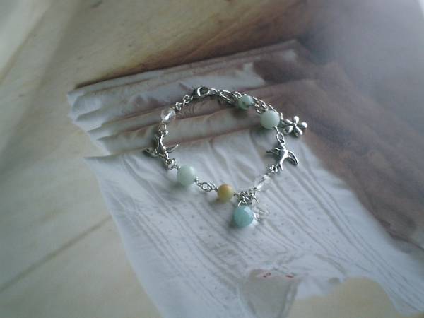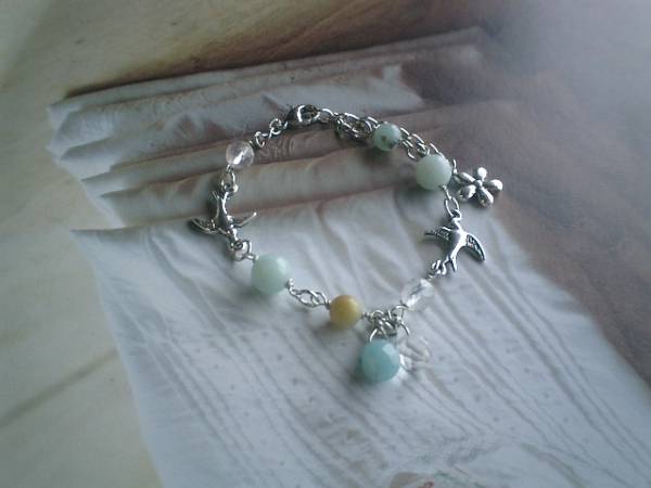 ジャンヌのコレクション・・シリーズです♪やさしい水色・・ふんわりやさしい淡い水色のアマゾナイトのブレスレットです♪大人っぽいラリエット風のデザインです♪水晶や小鳥さんのチャームを合わせて可憐な表情です♪アマゾナイトは8ミリ、6ミリの丸玉、水晶は6ミリのラウンドカットです♪トップは12×8ミリのアマゾナイトと水晶のドロップカットです♪長さは全長23センチ位で調節自由です♪お揃いのネックレスも出品しています♪シンプルで長く着けていただけるデザインを考えて作りました♪ハンドメイドをご理解頂いてノークレーム、ノーリターンでお願いします