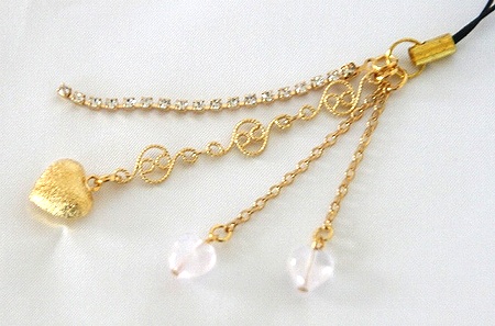 ★櫻★ハートとスワロフスキーラインストラップ♪Gold:g010:携帯用ストラップ,バッグチャーム,キーホルダー,ファスナーチャーム