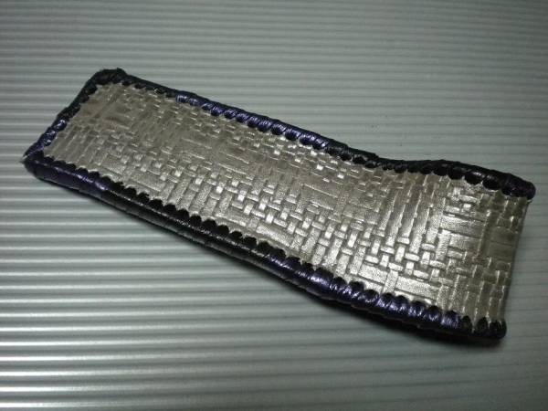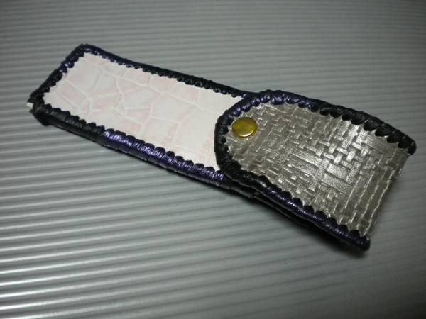 ケース周囲は、ブラックレザーとパープルメタリックレザーをつないで、かがり仕上げをしました。