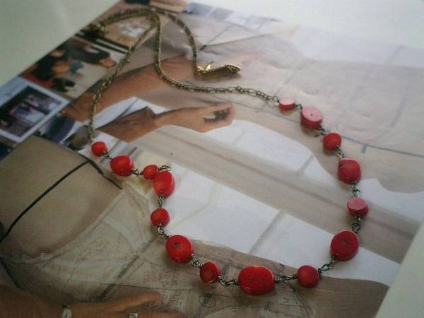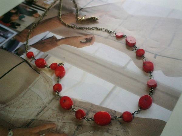 ニューヨーク・デッサン・・シリーズです♪小粋な赤・・シックな珊瑚のネックレスです♪深い赤の珊瑚にデザインチェーンを合わせて大人のロマンチックしています♪7ミリから11ミリ位の珊瑚のコインはランダムに繋いで可憐な表情です♪長さは全長77センチ位で調節自由です♪お揃いのネックレスやブレスレットも出品しています♪シンプルで飽きのこないいつまでも着けられるデザインを考えて作りました!ハンドメイドをご理解頂いてノークレーム、ノーリターンでお願いします