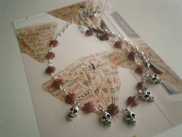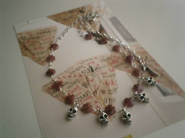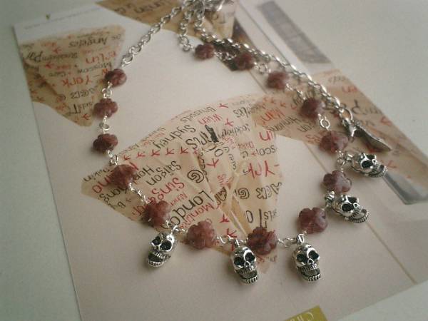 ジャンヌの幸せ・・シリーズです♪髑髏さんに恋して・・キュートな髑髏さんとモスコバイトのネックレスです♪メタリックな髑髏にモスコバイトのクロスフラワーを合わせて可憐な表情です♪髑髏さんは15ミリ×9ミリ位、モスコバイトは10ミリ位です♪長さは全長63センチ位で調節自由です♪チョーカー風にされても素敵です♪お揃いのブレスレットやピアスも出品しています♪シンプルで合わせやすいデザインを考えて作りました♪♪ハンドメイドをご理解頂いてノークレーム、ノーリターンでお願いします