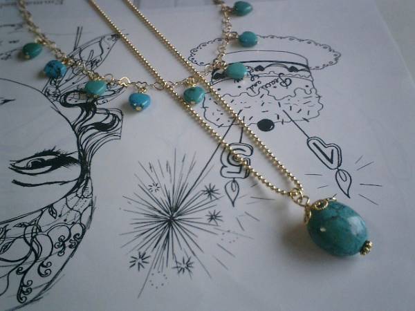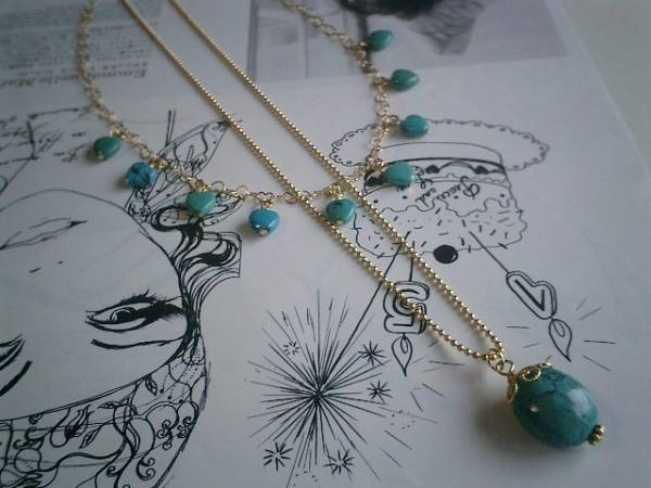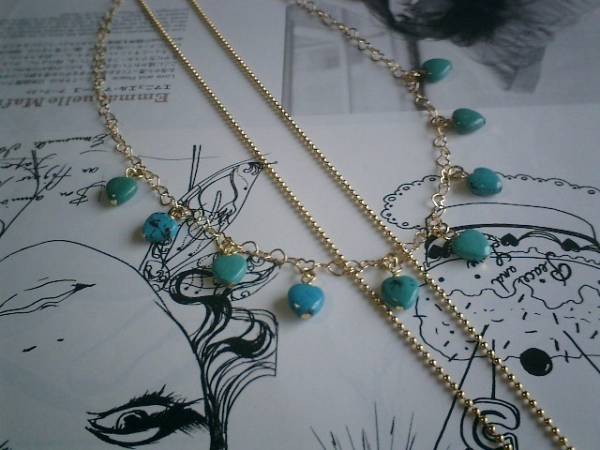 ニューヨーク・デッサン・・シリーズです♪シックなハート・・ターコイズのネックレス2点セットです♪ハートとタンブルのデザイン違いのターコイズが大人っぽい表情です♪8ミリのターコイズのハートにはハートのデザインチェーンを合わせました♪長さは全長70センチ位で調節自由です♪チョーカー風にされても素敵です♪クラシカルな座金でおめかししたターコイズのタンブルは18ミリ×15ミリ位です♪華奢なボールチェーンを合わせました♪長さは78センチ+アジャスター14センチで最長92センチ位です♪それぞれ単品やお揃いのブレスレットやピアスも出品しています♪シンプルで飽きのこないいつまでも着けられるデザインを考えて作りました!ハンドメイドをご理解頂いてノークレーム、ノーリターンでお願いします