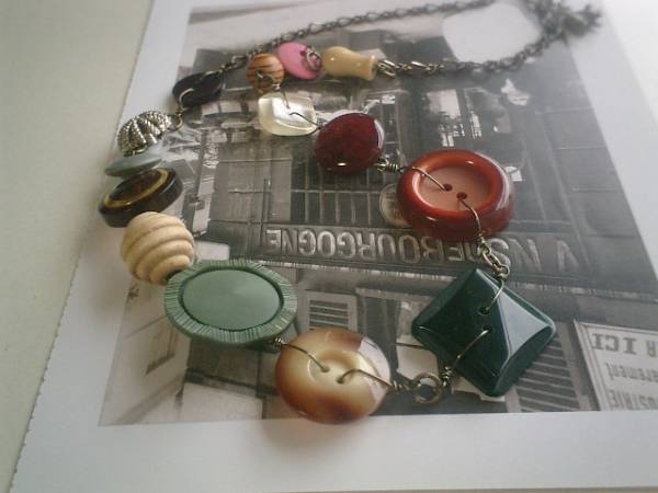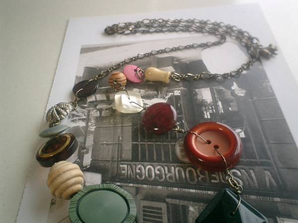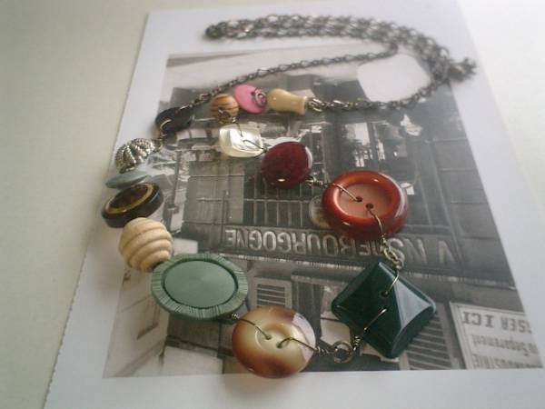 コレットの宝石箱・・シリーズです♪巴里色の異素材を紡いで・・10ミリから28ミリ位までの秋色のウッドやアンティークボタンを紡いでシックなネックレスです♪深いお色や個性的なデザインのウッドやボタンがノスタルジックな表情です♪長さは全長82センチ位で調節自由です♪チョーカー風にされても素敵です♪お揃いのブレスレットも出品しています♪シンプルで長く着けられるデザインを考えて作りました!ハンドメイドをご理解頂いてノークレーム、ノーリターンでお願いします