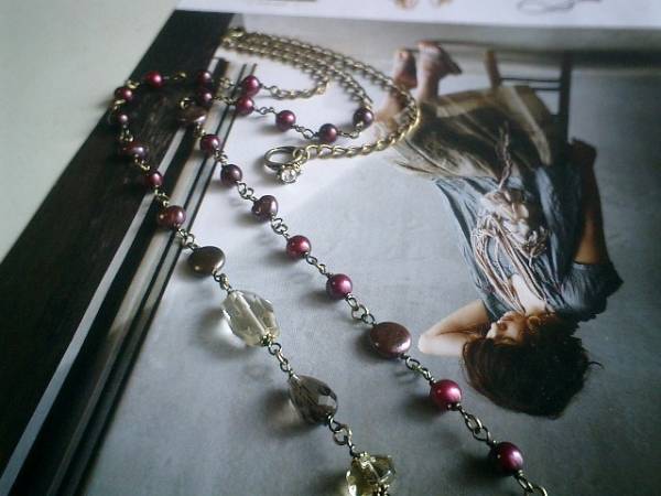 コレットの宝石箱・・シリーズです♪大人色のパール・・シックなダークレッドの淡水パールのネックレスです♪深い赤の淡水パールは6ミリ位のバロック、10ミリ位のコインです♪神秘的なラフカットのレモン水晶やオーバルカットのルチルクォーツ、ドロップカットのスモーキークォーツを合わせて秋のロマンチックしています♪長さは全長84センチ位で調節自由です♪2連にされても素敵です♪お揃いのブレスレットも出品しています♪シンプルで長く着けられるデザインを考えて作りました!ハンドメイドをご理解頂いてノークレーム、ノーリターンでお願いします