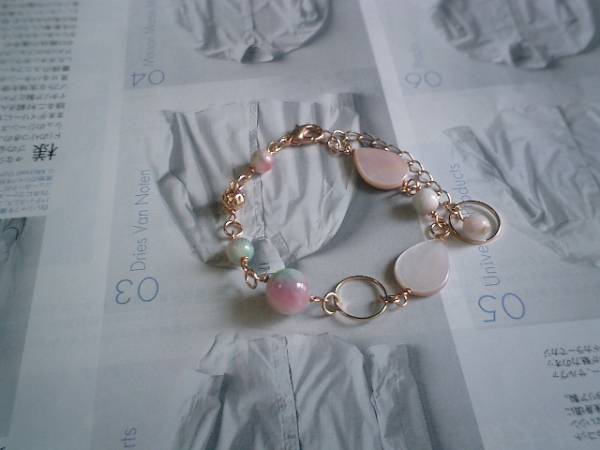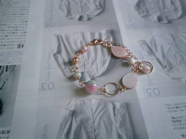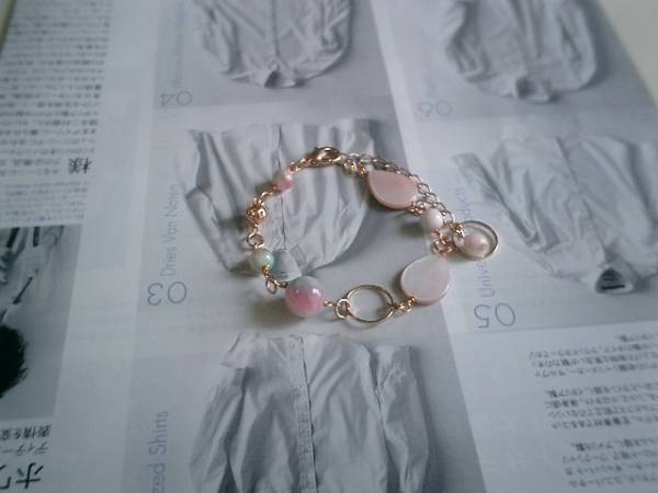 ガールズ・コレクション・・シリーズです♪キュートなピンクシェルとキャンディジェイドのブレスレットです♪16×12ミリ位のフラットオーバルのピンクシェルに6ミリ、10ミリの丸玉のキャンディジェイドやピンクゴールドのリング、チェーンを合わせてキュートモダンな表情です♪長さは全長23センチ位で調節自由です♪♪お揃いのネックレスも出品しています♪youko1357でも出品しています♪シンプルで飽きのこないいつまでも着けられるデザインを考えて作りました!ハンドメイドをご理解頂いてノークレーム、ノーリターンでお願いします