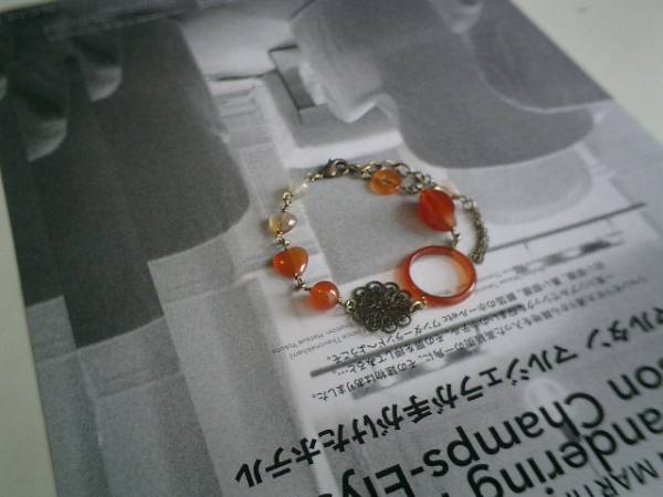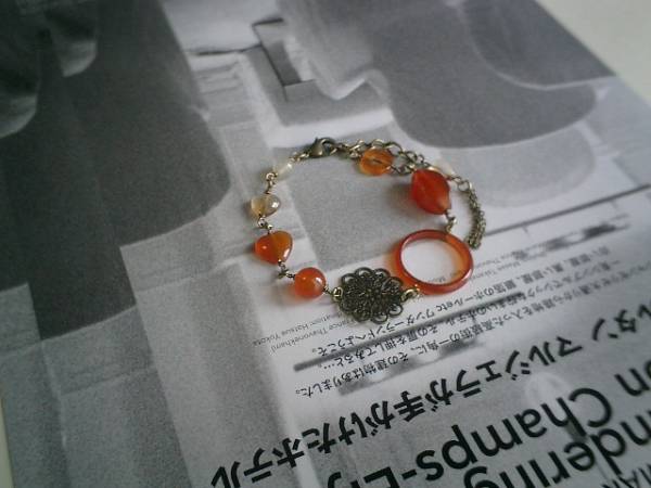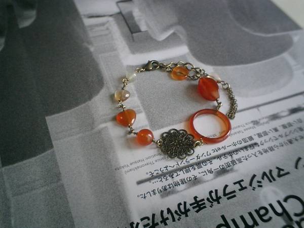 秋色クローゼット・・シリーズです♪カーネリアン・モチーフ・・キュートな秋色のブレスレットです♪6ミリから20ミリ位までの丸玉やコイン、ハートやリングやツイストナツメなど大きさ違い、デザイン違いのカーネリアンを集めて18ミリ位の透かしチャームを合わせました♪長さは全長23センチ位で調節自由です♪♪お揃いのネックレスやイヤリングも出品しています♪同じシリーズをyouko13570でも出品しています♪シンプルで飽きのこないいつまでも着けられるデザインを考えて作りました!ハンドメイドをご理解頂いてノークレーム、ノーリターンでお願いします