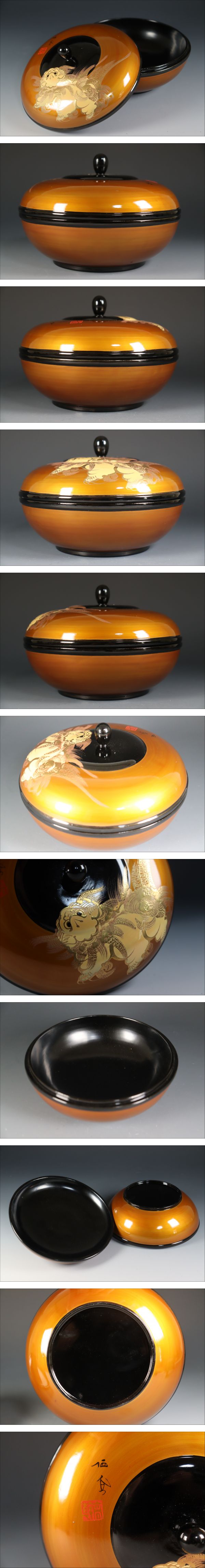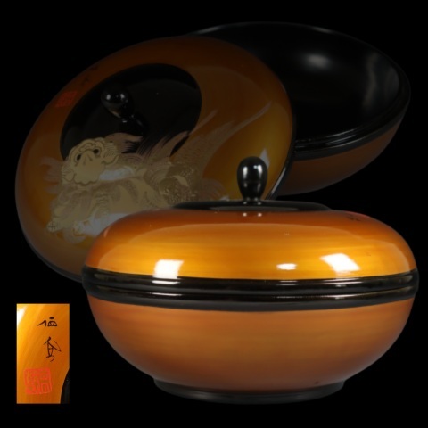 商品説明 | 商品名:蔵出し品 漆 作家造 獅子蒔絵 蓋物 付属品:なし。 サイズ:高さ12cm、口径16cm、高台10cm。 状態:無傷になります。 |