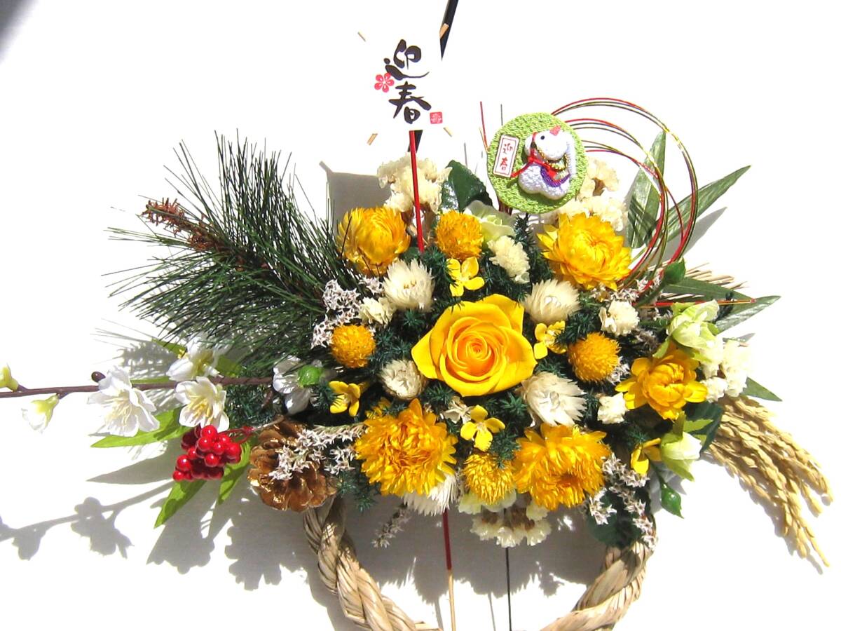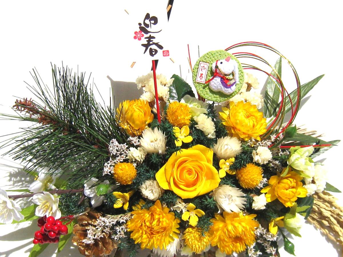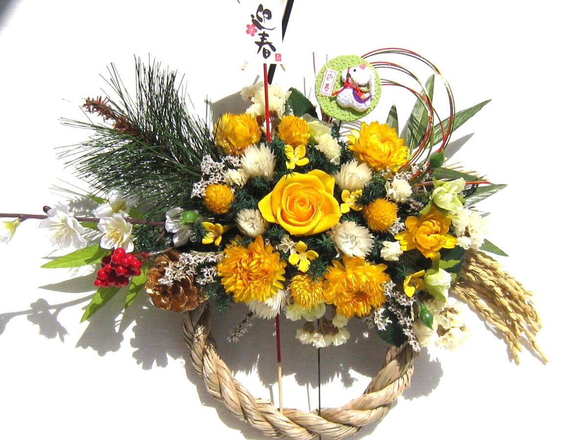 稲穂付き丸しめベースに松竹梅、千両、ミニバラ、ブバリア、プリザーブドの薔薇、