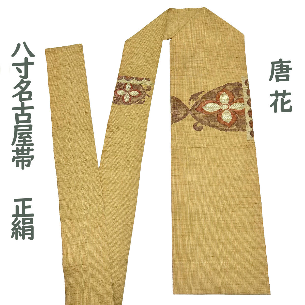 落ち着いたこれからの季節に似合う色合いのサンドベージュの紬地に、可愛い唐花が織り出された、デザインがとても良い八寸名古屋帯です。どうぞこの機会にご検討下さい!