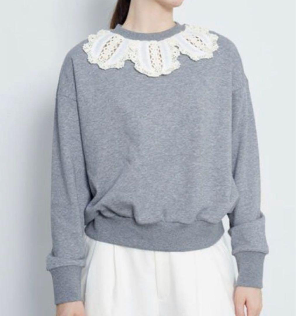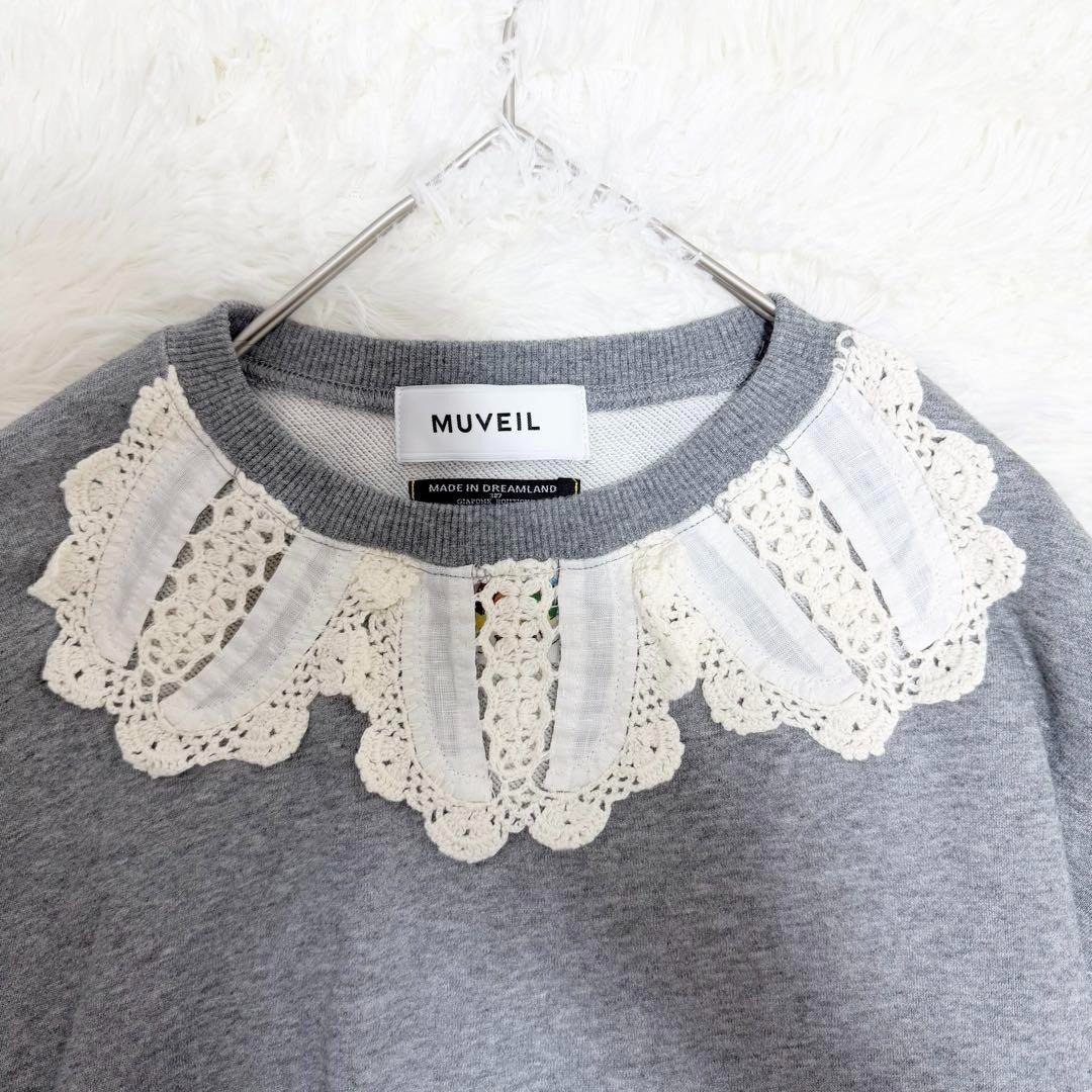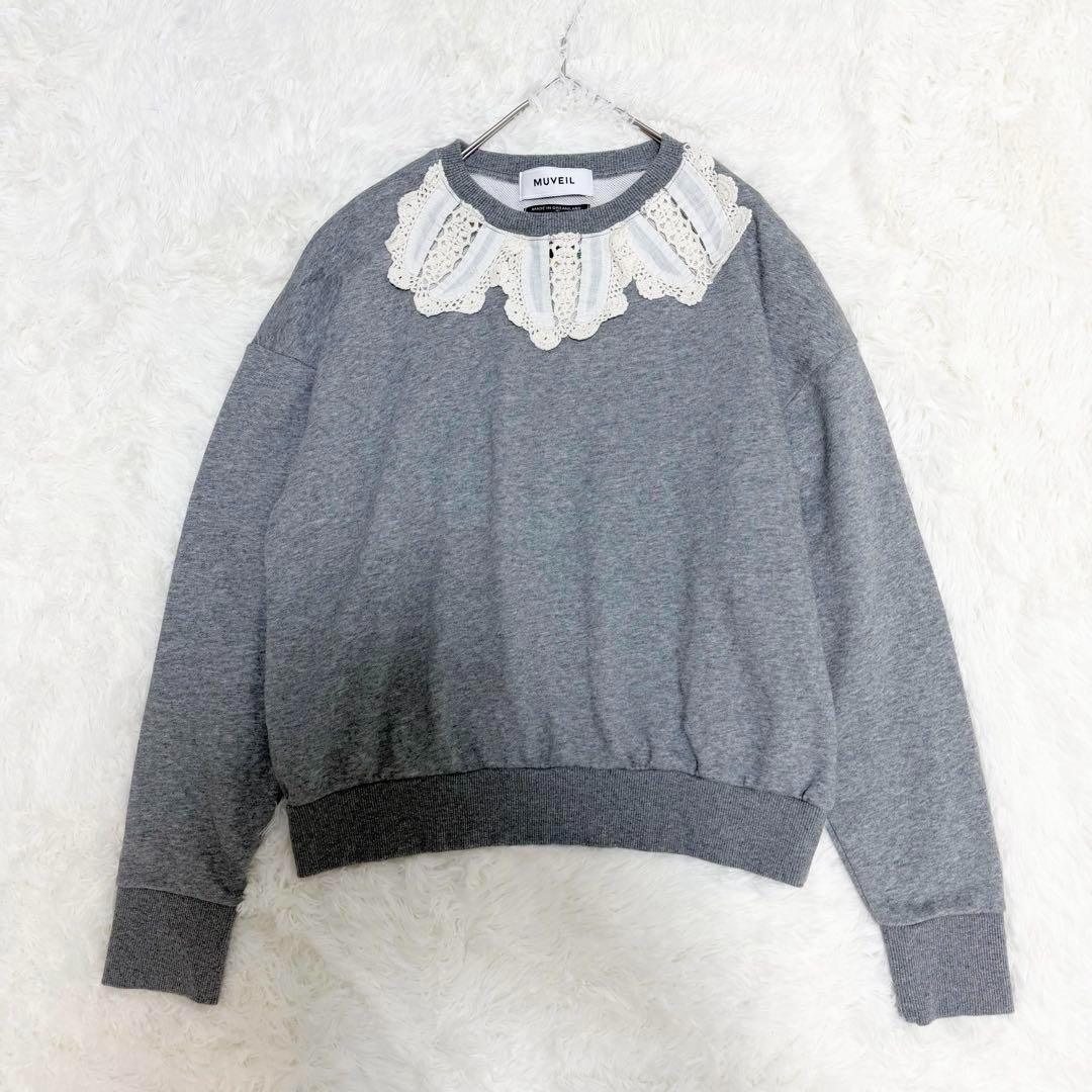 MUVEIL ミュベール スウェット トレーナー フリル レース襟 クルーネック グレー トップス カジュアル フェミニン 大人可愛い 春秋コーデ