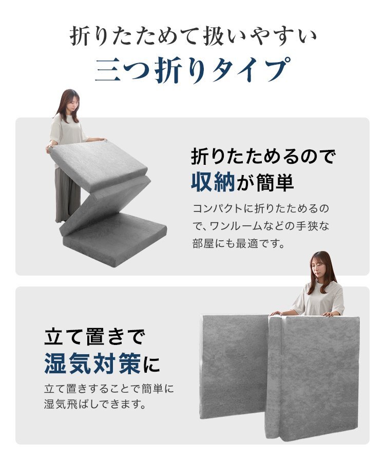適度な硬さで身体をしっかり支える、三つ折りタイプの高反発マットレスです。 柔らかいマットレスとは違い、身体の沈み込みを軽減した腰に優しい寝心地です。 高反発マットレスのウレタンフォームは弾性が高く、適度な硬さで身体を支えるので、底つき感もなくへたりにくいマットレスです。 寝返りが多い方や仰向けに寝ることが多い方におススメです。 簡単にたためる三つ折りタイプなので、お部屋で立て置きして日当たりのいい場所で部屋干しが可能! 取り外しやすいL字ファスナー付き洗えるカバーが付属しています! 【商品仕様】 カラー:ブラウン、ベージュ サイズ(約):幅97cm×長さ195cm×厚み10cm(シングルサイズ) 折り畳み時(約):幅97cm×長さ65cm×厚み30cm 素材:高反発ウレタン 、パイル生地 他 硬さ:190ニュートン |