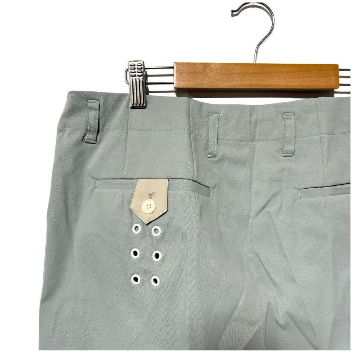 サイドの切り替えラインがスポーティーさもミックスし独特な雰囲気のアイテムに仕上がっています。 左後ろポケット下に、オリジナルアイレットを使した、ブランドアイデンティティーの6ホールアイレットデザインを配しています。