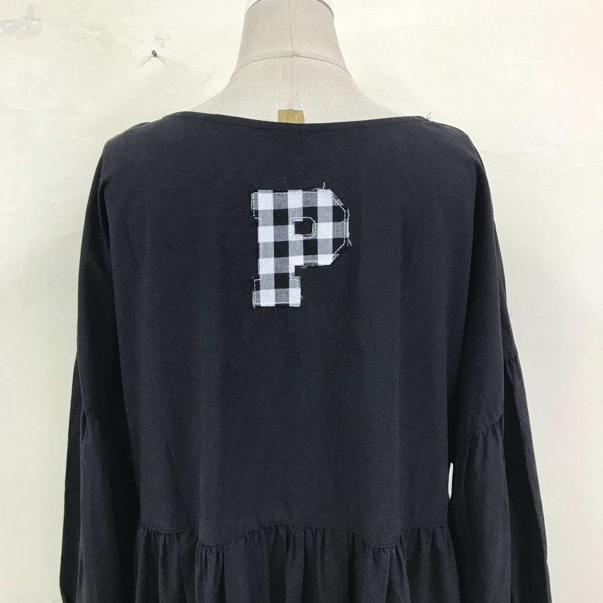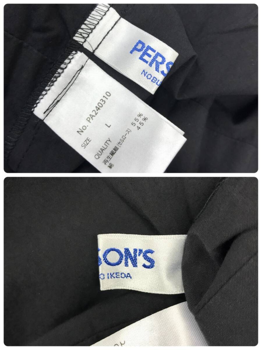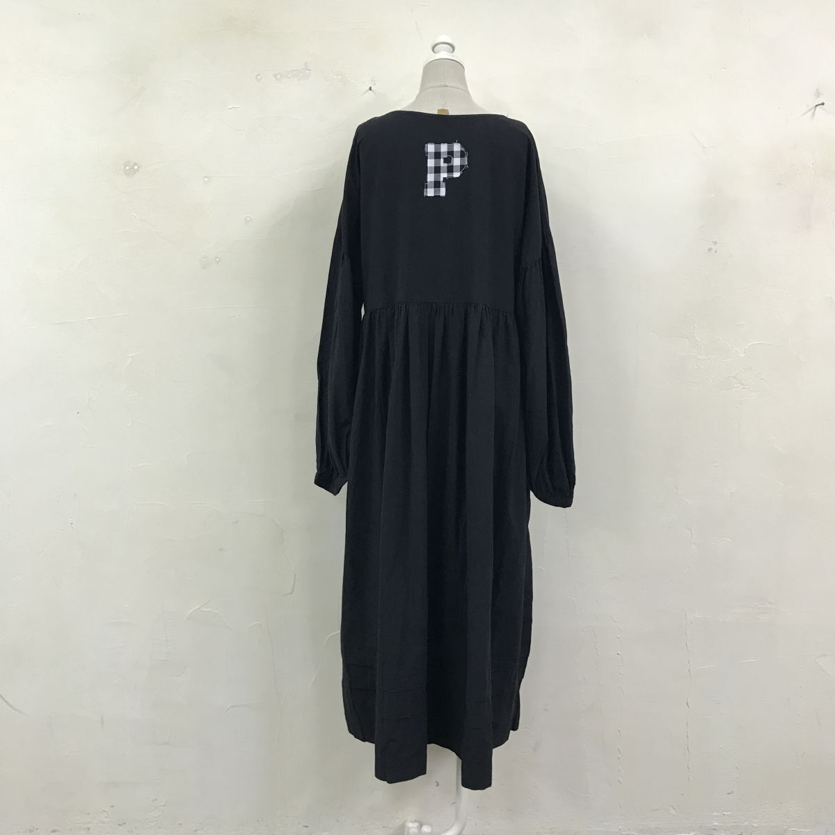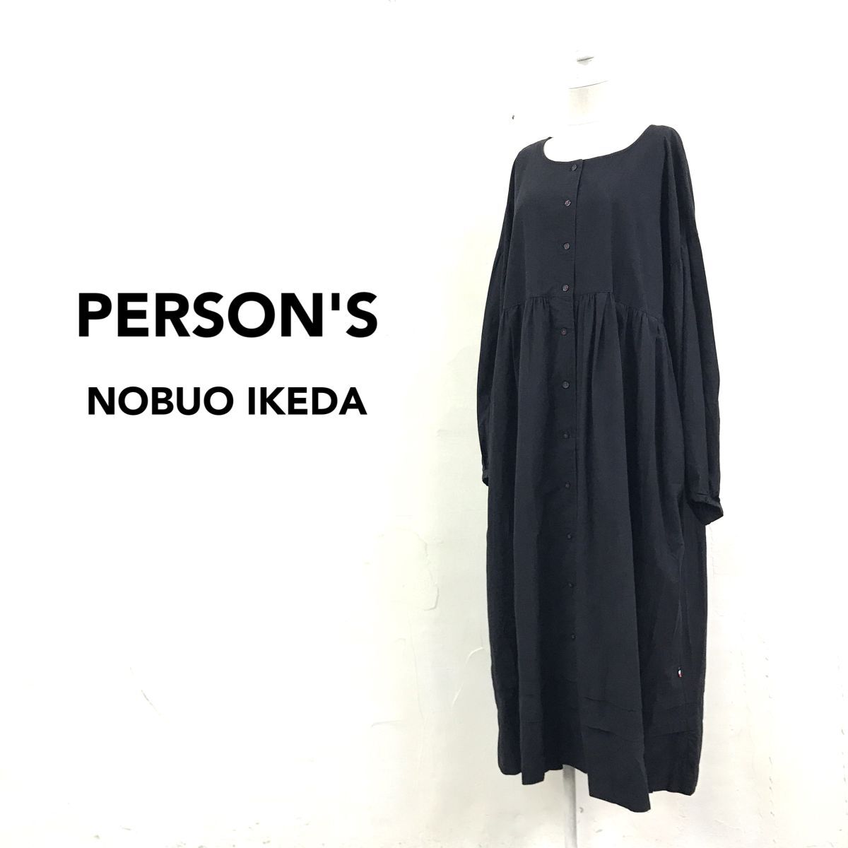 2O2140-G◆ PERSON'S パーソンズ ノブオイケダ フレアロングシャツワンピース ギャザースリーブ Uネック アルファベット ◆ sizeL 黒 綿