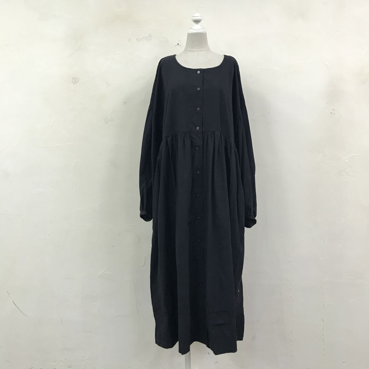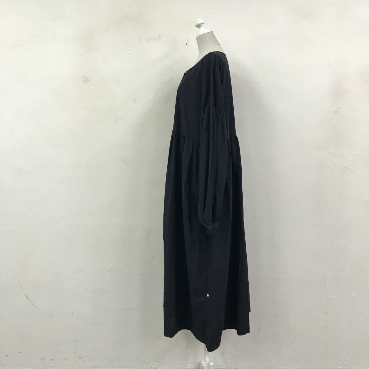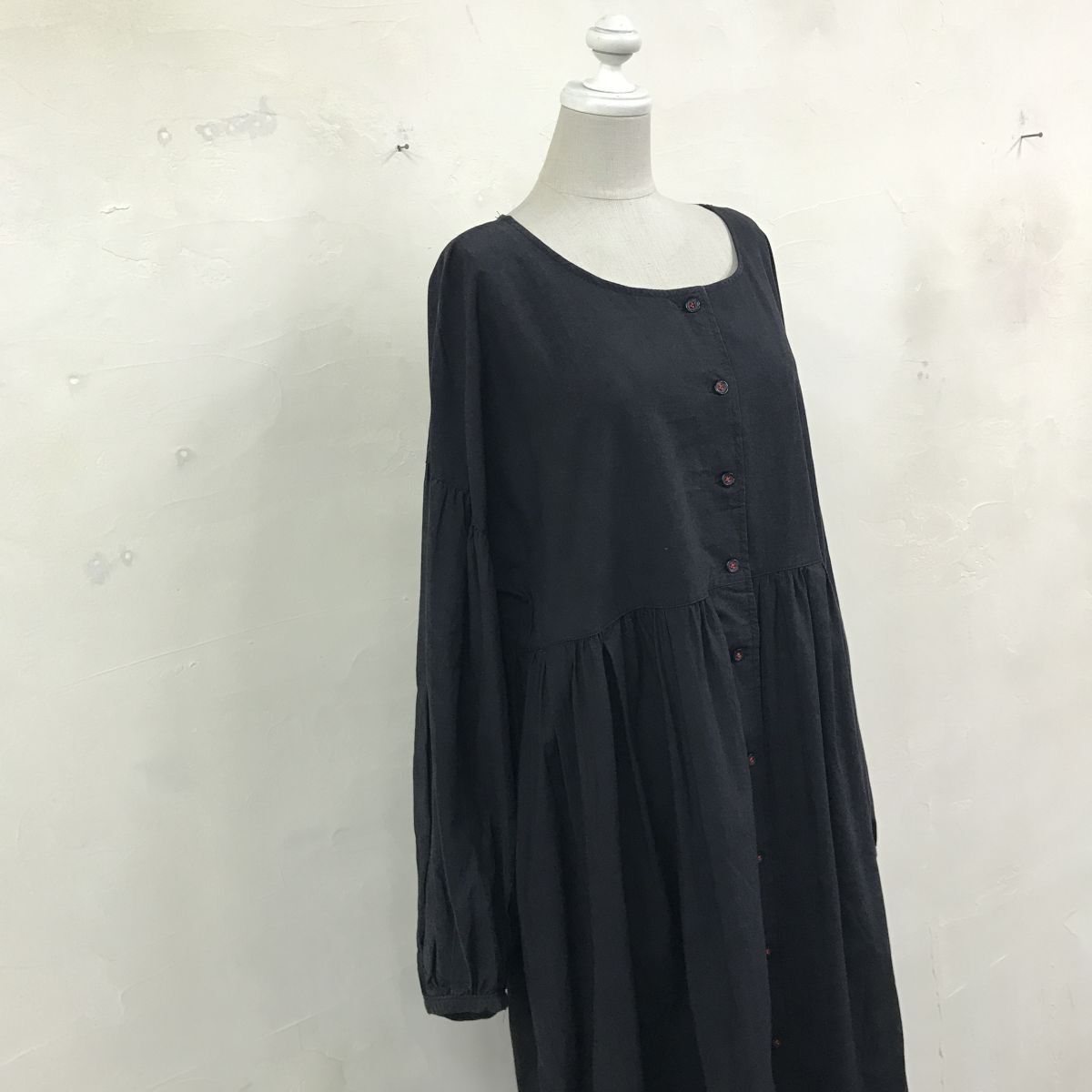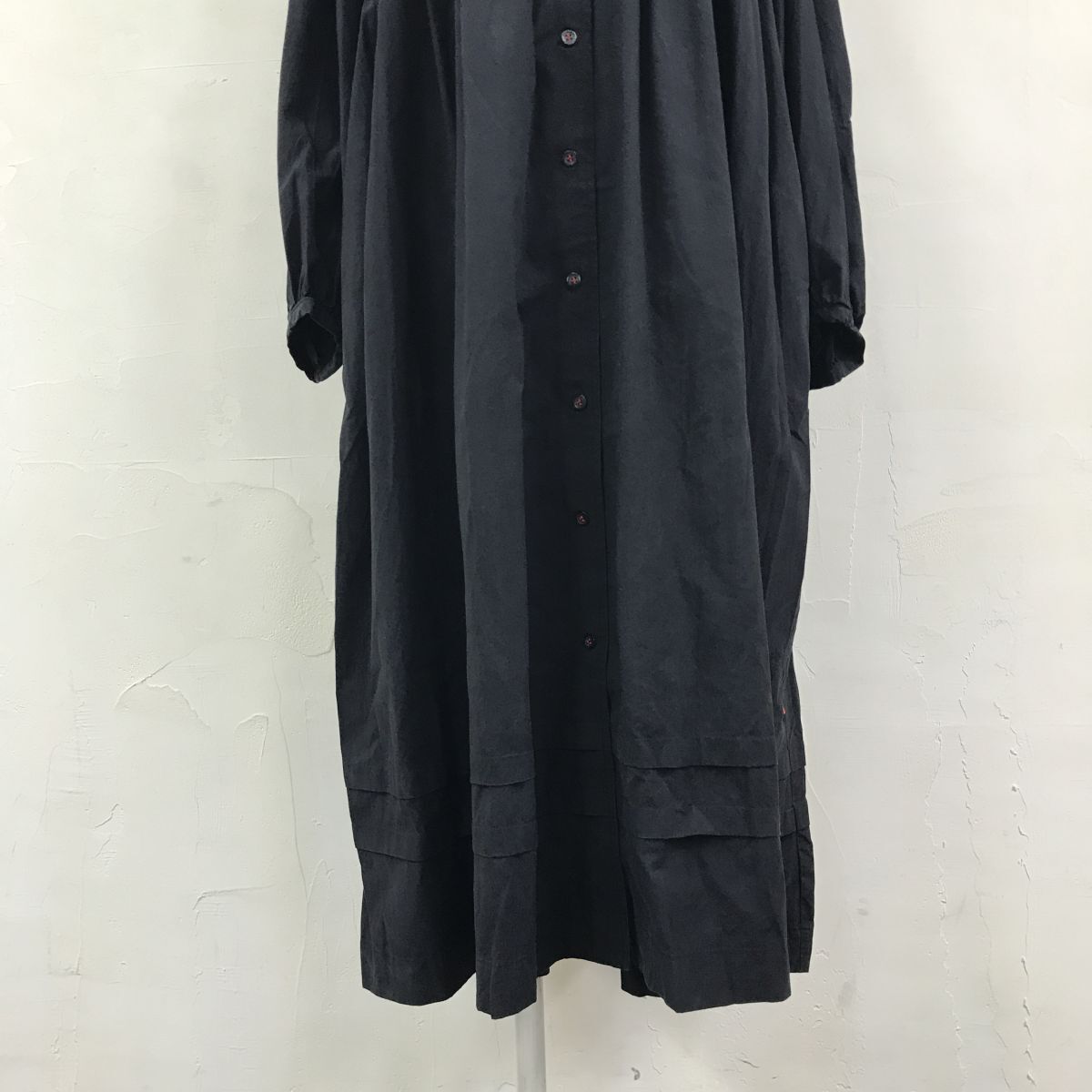 2O2140-G◆ PERSON'S パーソンズ ノブオイケダ フレアロングシャツワンピース ギャザースリーブ Uネック アルファベット ◆ sizeL 黒 綿