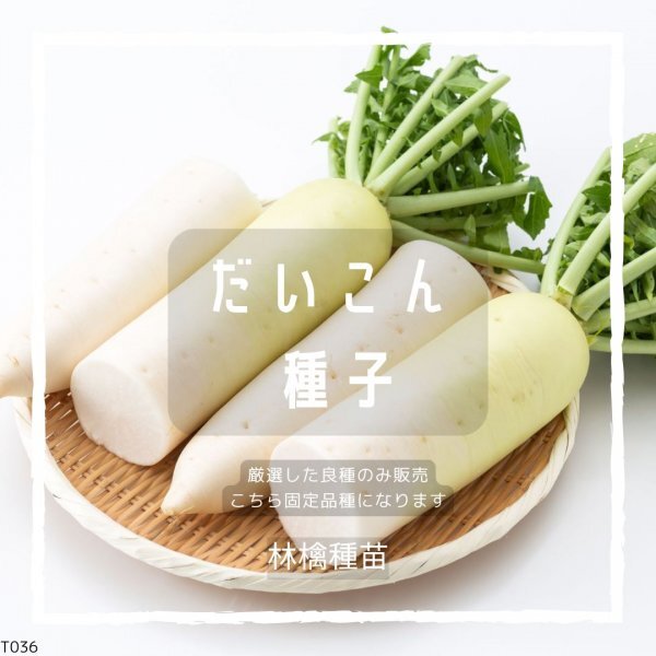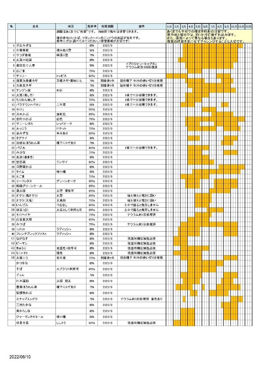 早生みずな / 中葉春菊 / サラダ春菊 / 丸葉小松菜 / ニンジン / 白ごま / チコリー / 浅黄九条細ネギ / 九条太ネギ / チンゲン菜 / 大葉(青しそ) / ちりめん赤しそ / パラマウントパセリ / セロリ / 万木かぶ / 金町小かぶ / サニーレタス / ルッコラ / 赤みずな / タアサイ / 次郎丸ほうれん草 / バジル / みぶな / 高菜(春まき) / 空芯菜 / 日野菜かぶ / タイム / えごま / リーフレタス / 縮緬グリーンケール / 島大根 / 島オクラ / しまな(島菜) / オクラ(五竜) / 枝豆(白) / 大根 / モロヘイヤ / みつば / コメット / フレンチブレックファスト / ながなす / ピーマン / きゅうり / ミニトマト / いんげん