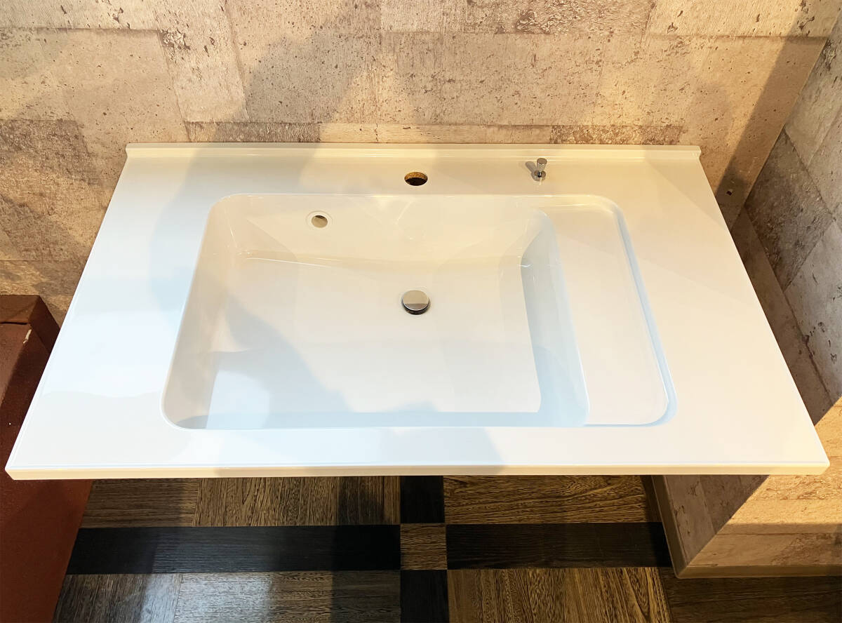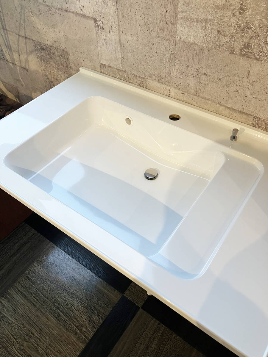 90cm幅ながら天板は人工大理石製でボール一体型(フランジレス排水)となっており、