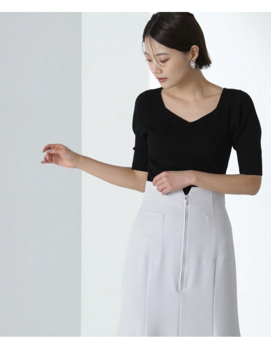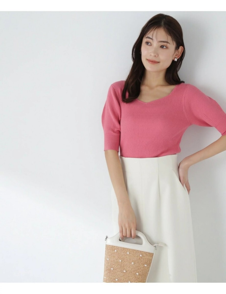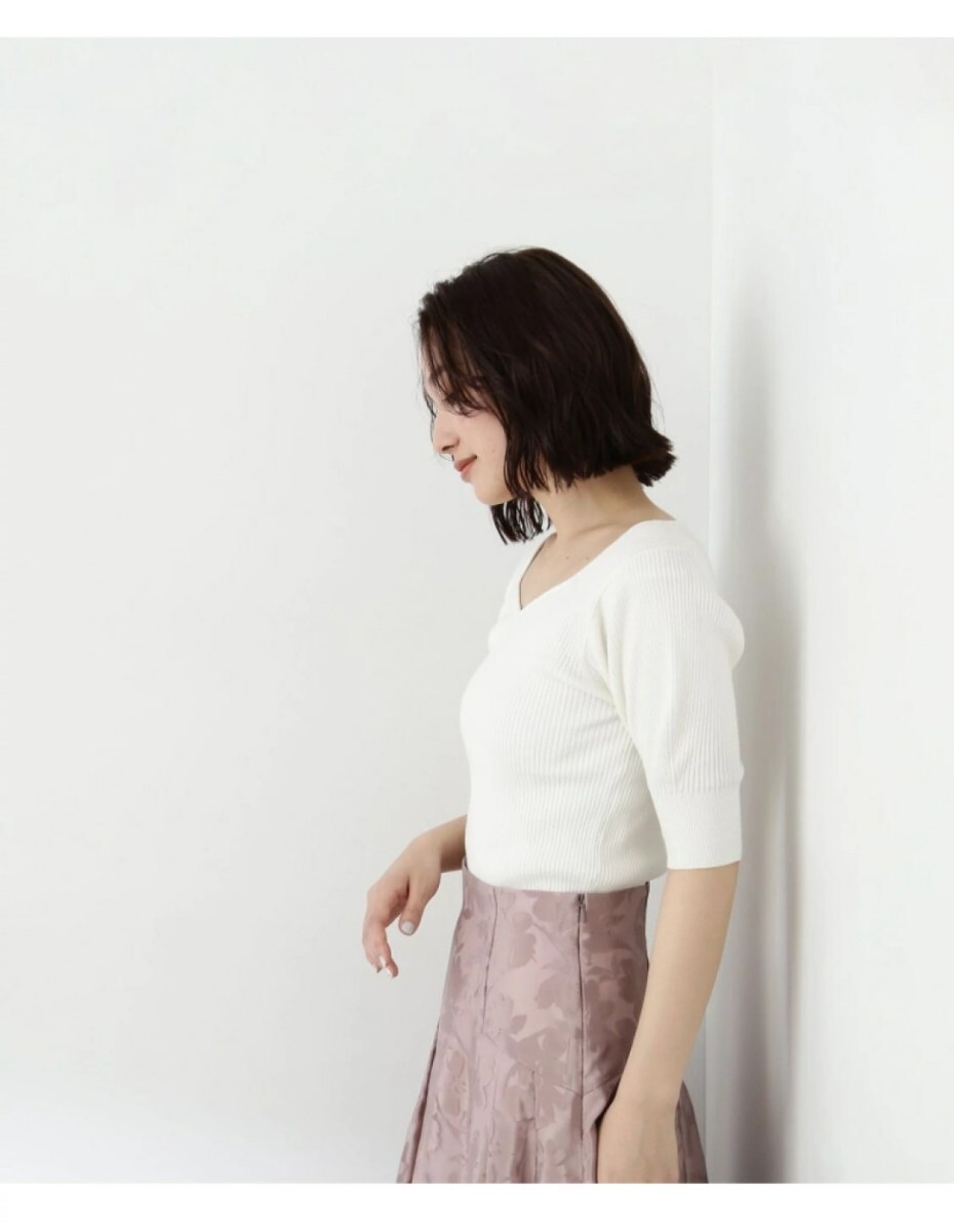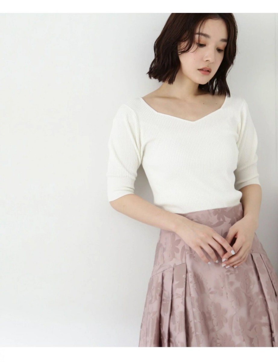 シンプルながらも女性らしいダイヤモンドネックがポイントのリブニットです。