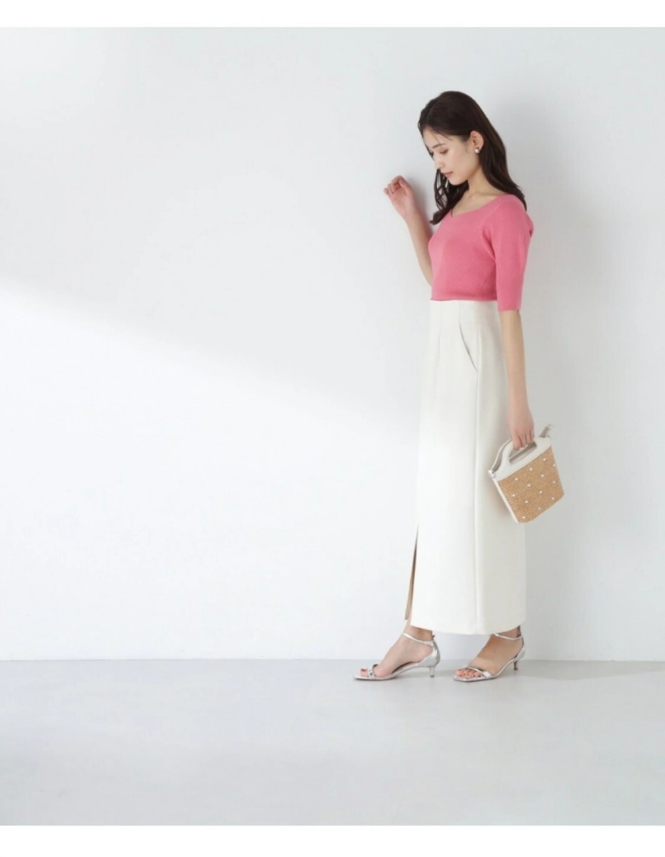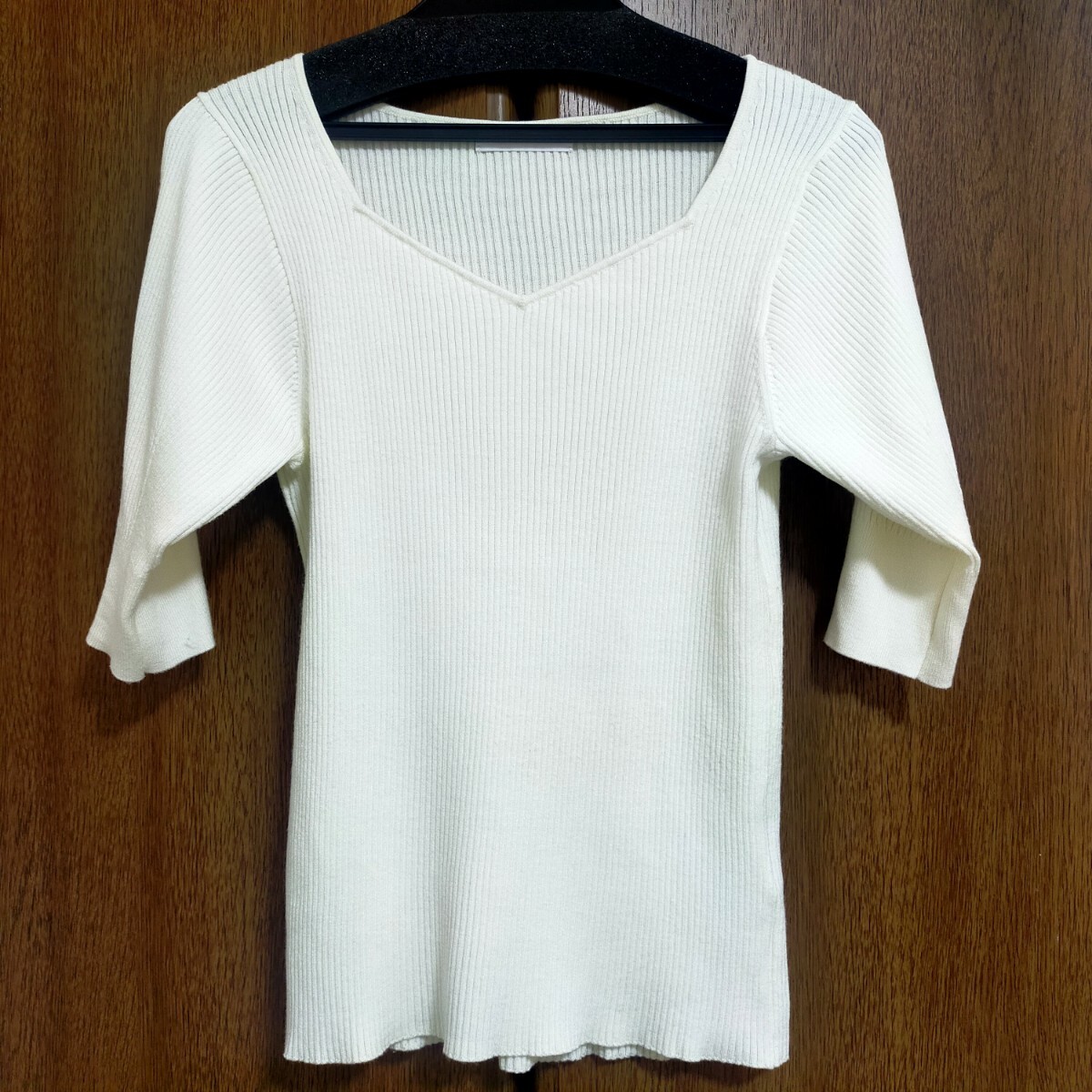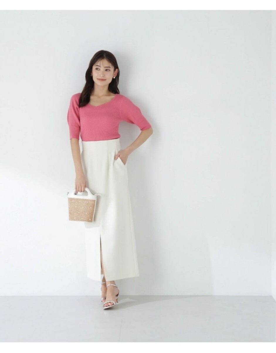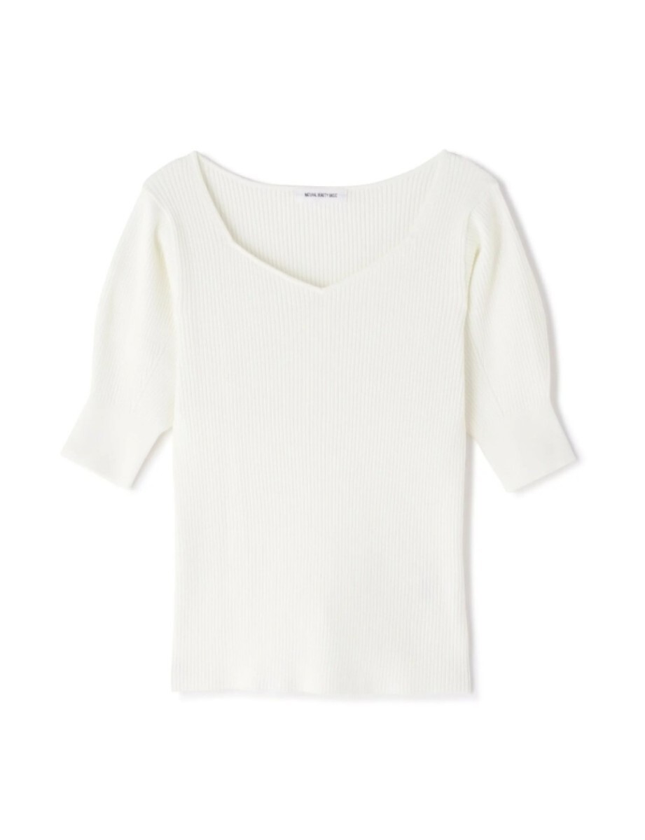シンプルながらも女性らしいダイヤモンドネックがポイントのリブニットです。