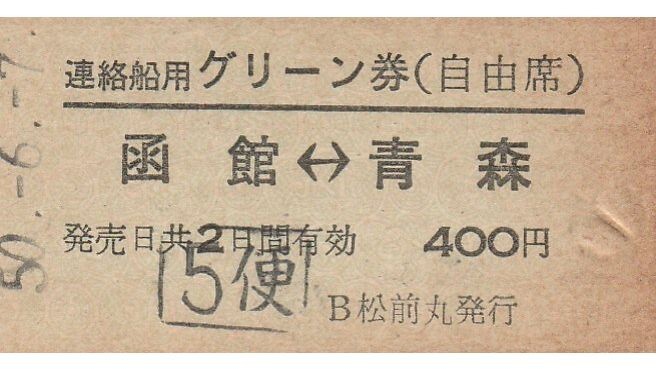 H026.【船中発行:松前丸】連絡船用グリーン券(自由席)函館⇒青森 5便 50.6.7【5746】
