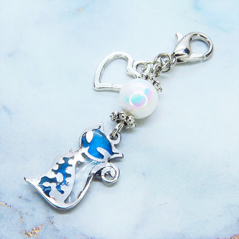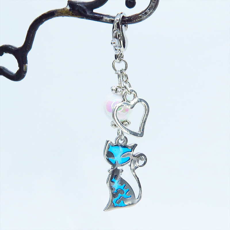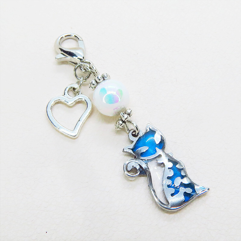 マスク・スマホチャーム シルバーカラー 猫モチーフとガラスクリスタルのチャーム レジン マリンブルー 金具変更可