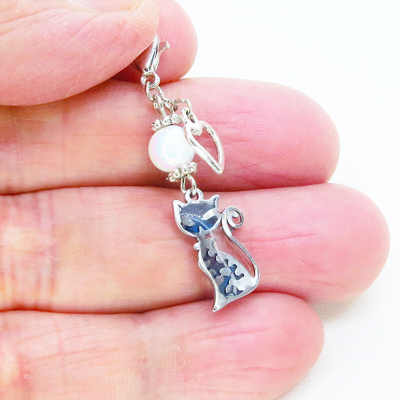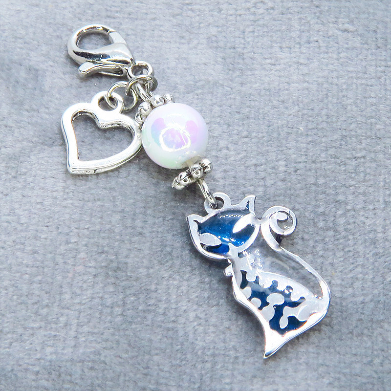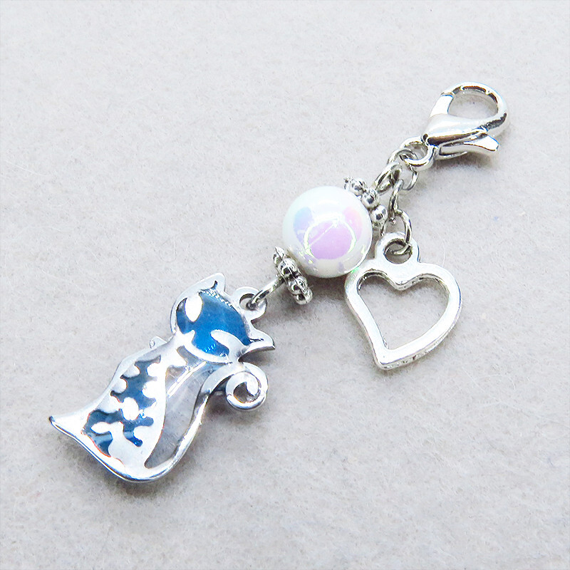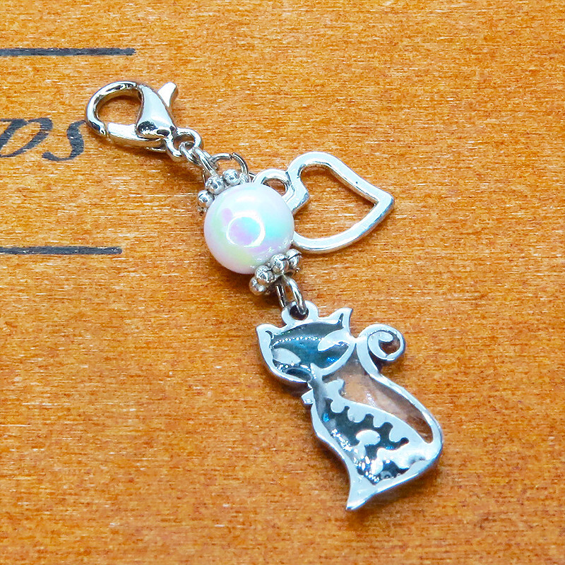 ステンレス製の猫シルエットモチーフとガラス・クリスタルビーズを組合せたコンパクトなチャームです