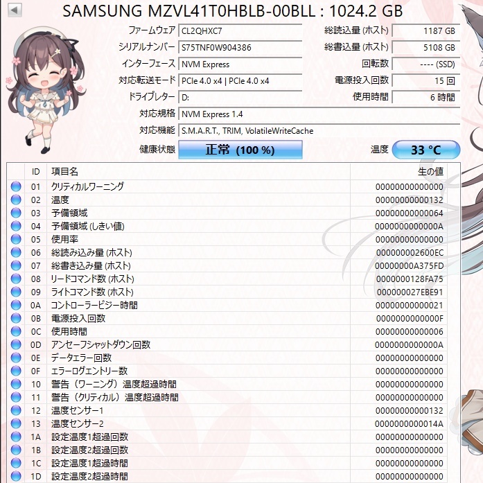 【中古】SAMSUNG PM9B1 1TB MZVL41T0HBLB-00BLL [M.2 2280 NVMe PCIe4.0x4 TLC 健康状態:100%]