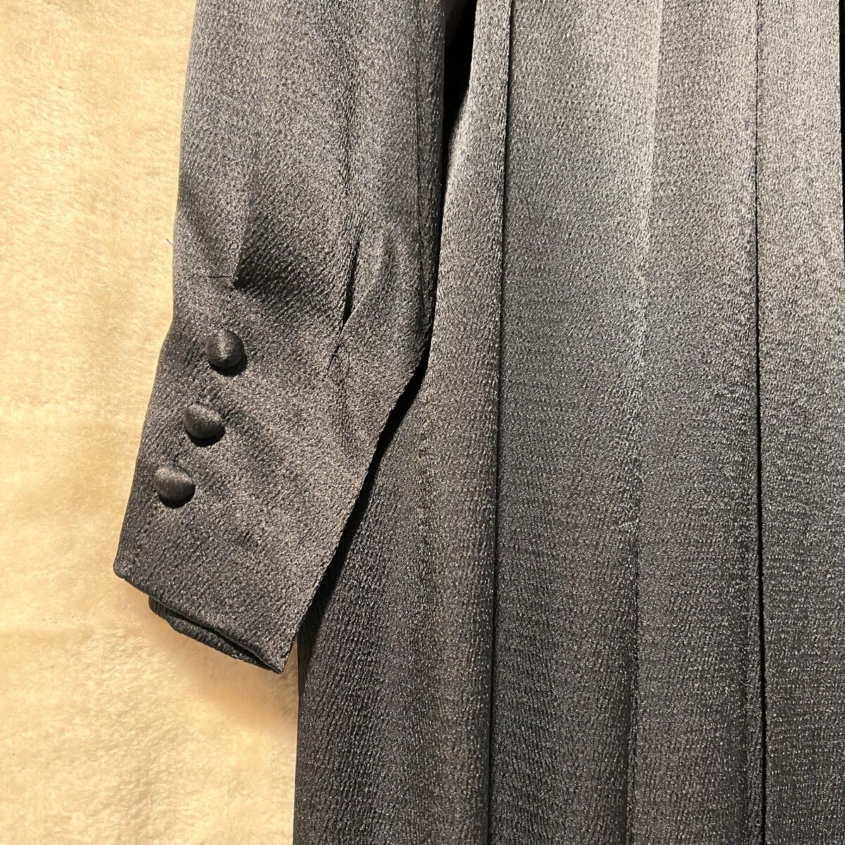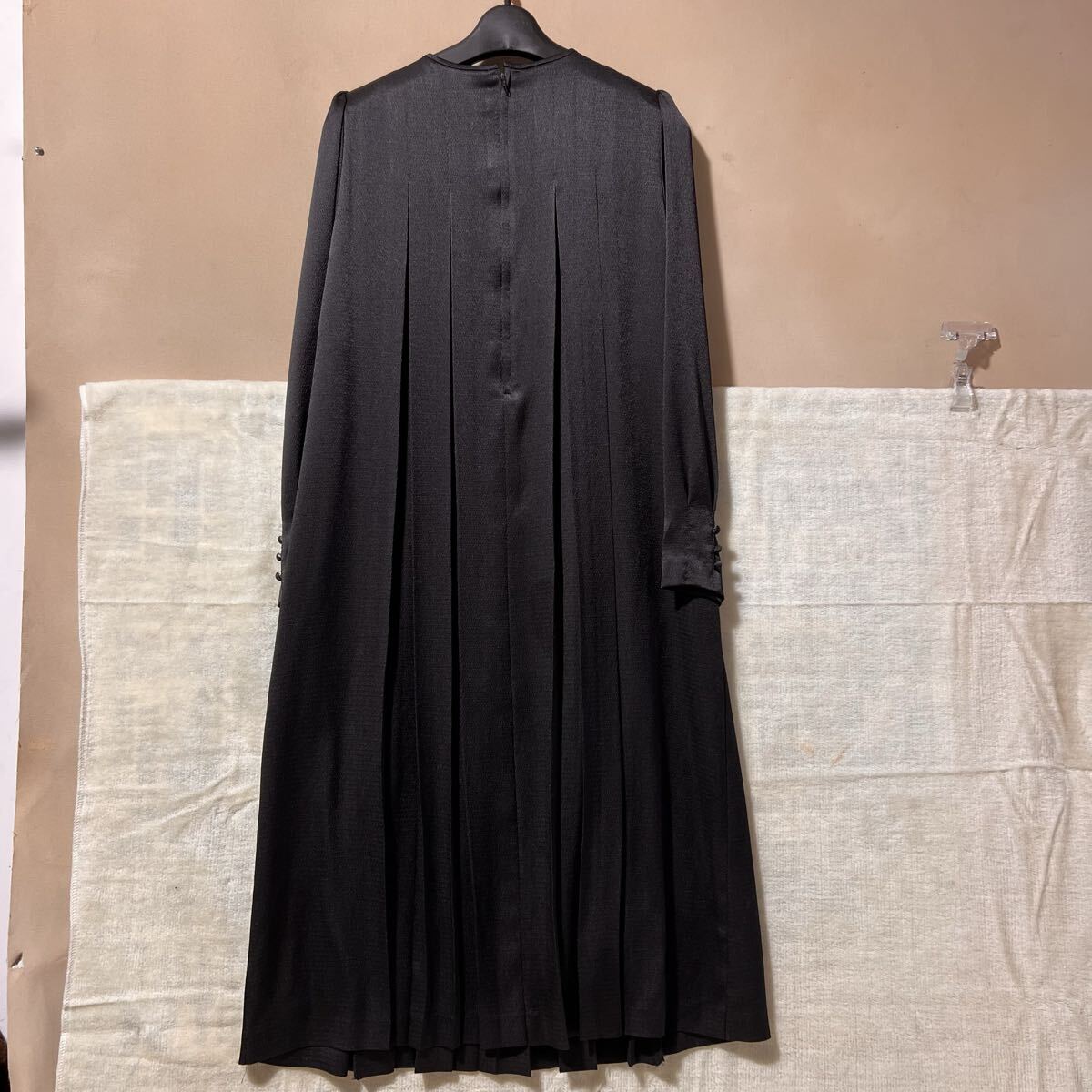 このワンピースは、黒のロングスリーブドレスで、フォーマルな場での着用に適したデザインです。生地にはわずかな光沢と細かい織り目があり、落ち着いた印象を与えます。