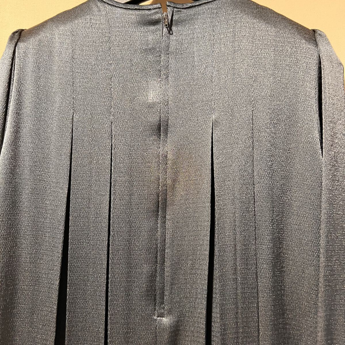 デザイン: 襟ぐりは丸首で、身頃全体にプリーツ(ひだ)が縦に入っています。袖は長袖で、袖口には丸い飾りボタンが3つあしらわれたカフスデザインです。着脱は背中のコンシールファスナーで行います。