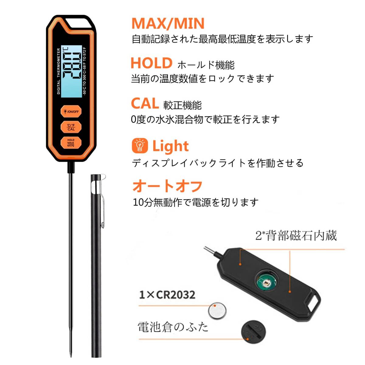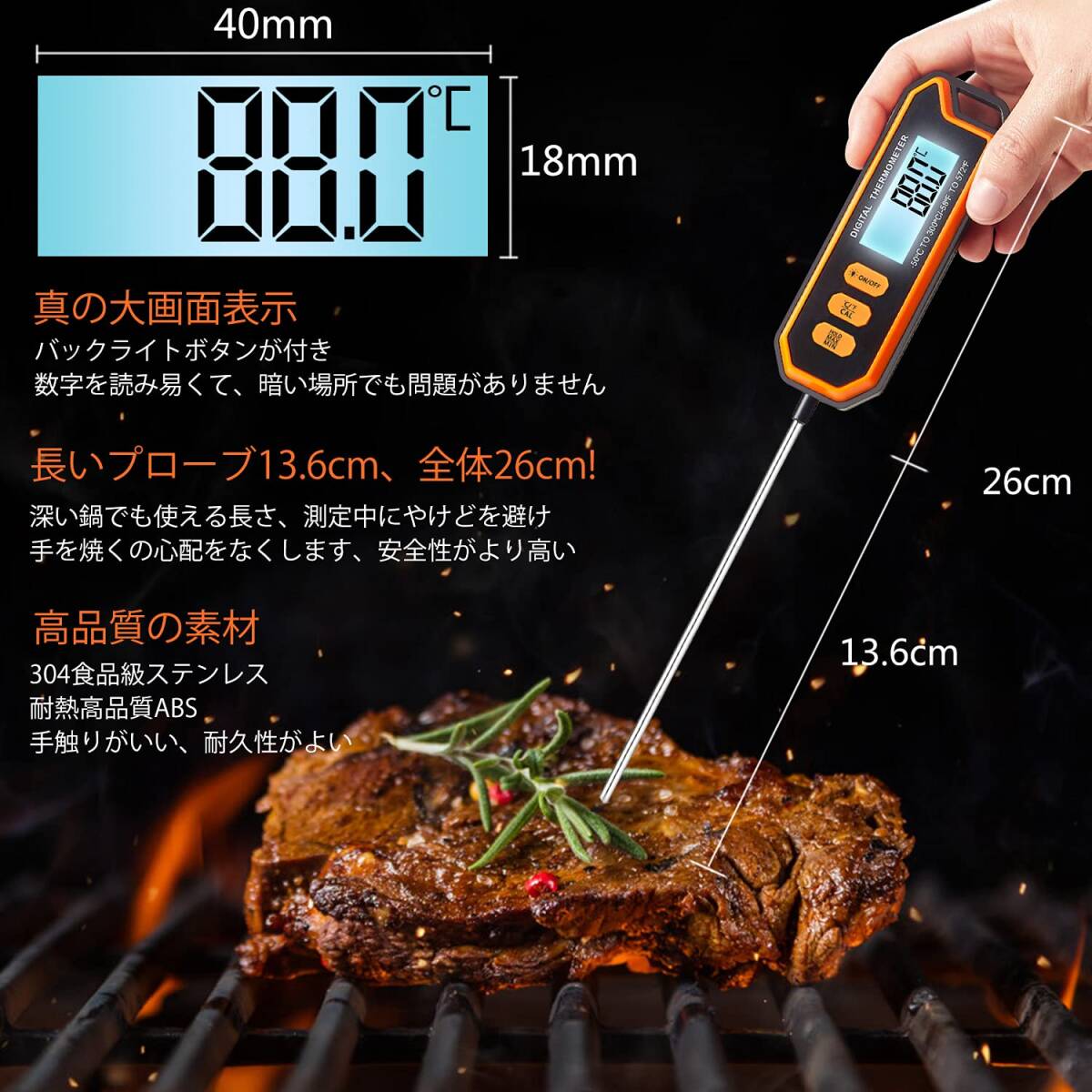 大画面表示(長さ40x幅18mm)で数字が読みやすく、バックライトボタンが付いているため暗い場所でも使用可能です。また、食品用ステンレスを使用した長めのプローブ(全体長さ26cm)が付属しており、測定中のやけどを防ぎます。