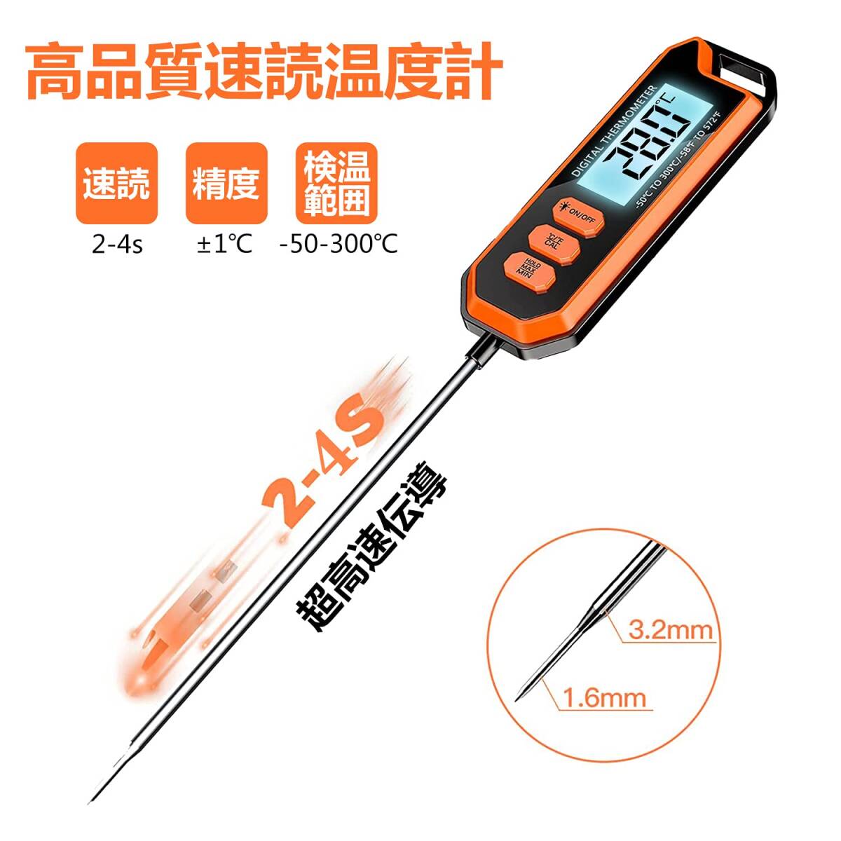◎1~3日以内での発送完了を目指しております。商品説明:こちらの実用的な温度計は、速読2~4秒での高精度な測定が可能です。測定温度範囲は-50~300度で、最小表示は0.1度、精度は±1℃(0℃~150℃)、±2℃のその他の範囲となっています。