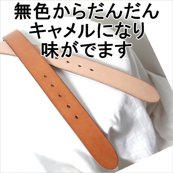 使用するとブラウン色へと変化しあじが出ます、1枚革で幅は40mm、革の厚さは4,5mm、ハードですがだんだんとしなやかになってゆきます