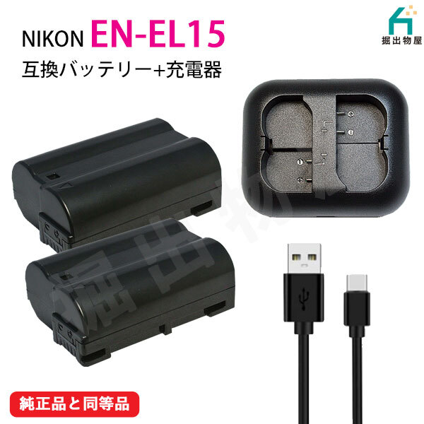ニコン(Nikon) EN-EL15 互換 バッテリー 2個 + 充電器(USB 2個同時充電 タイプ)セット 残量表示 対応 コード 00128x2-00180