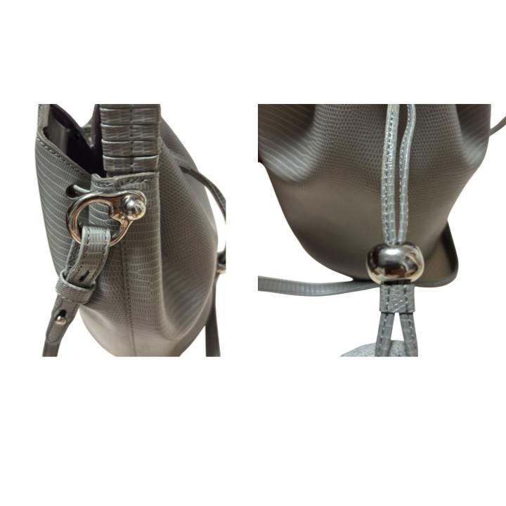 このバケット型ショルダーバッグは、洗練されたグレーの色合いが特徴で、どんなコーディネートにもマッチします。