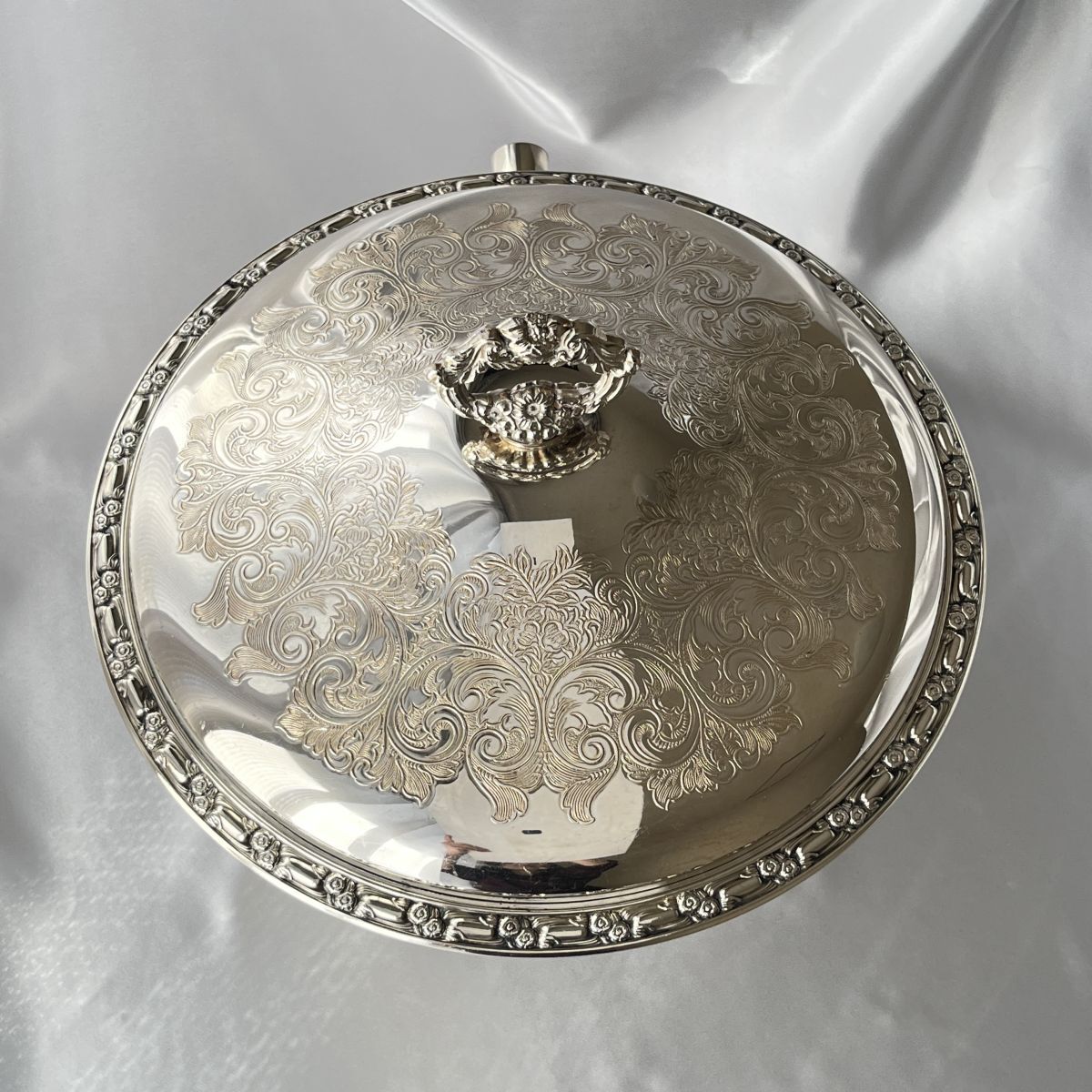 ドーム型の蓋は豊かなチェイシングと飾りハンドル、