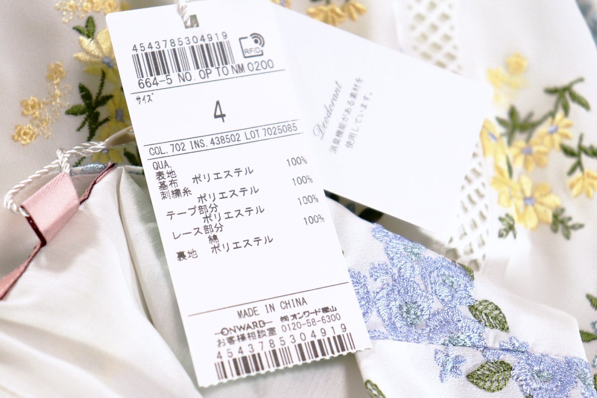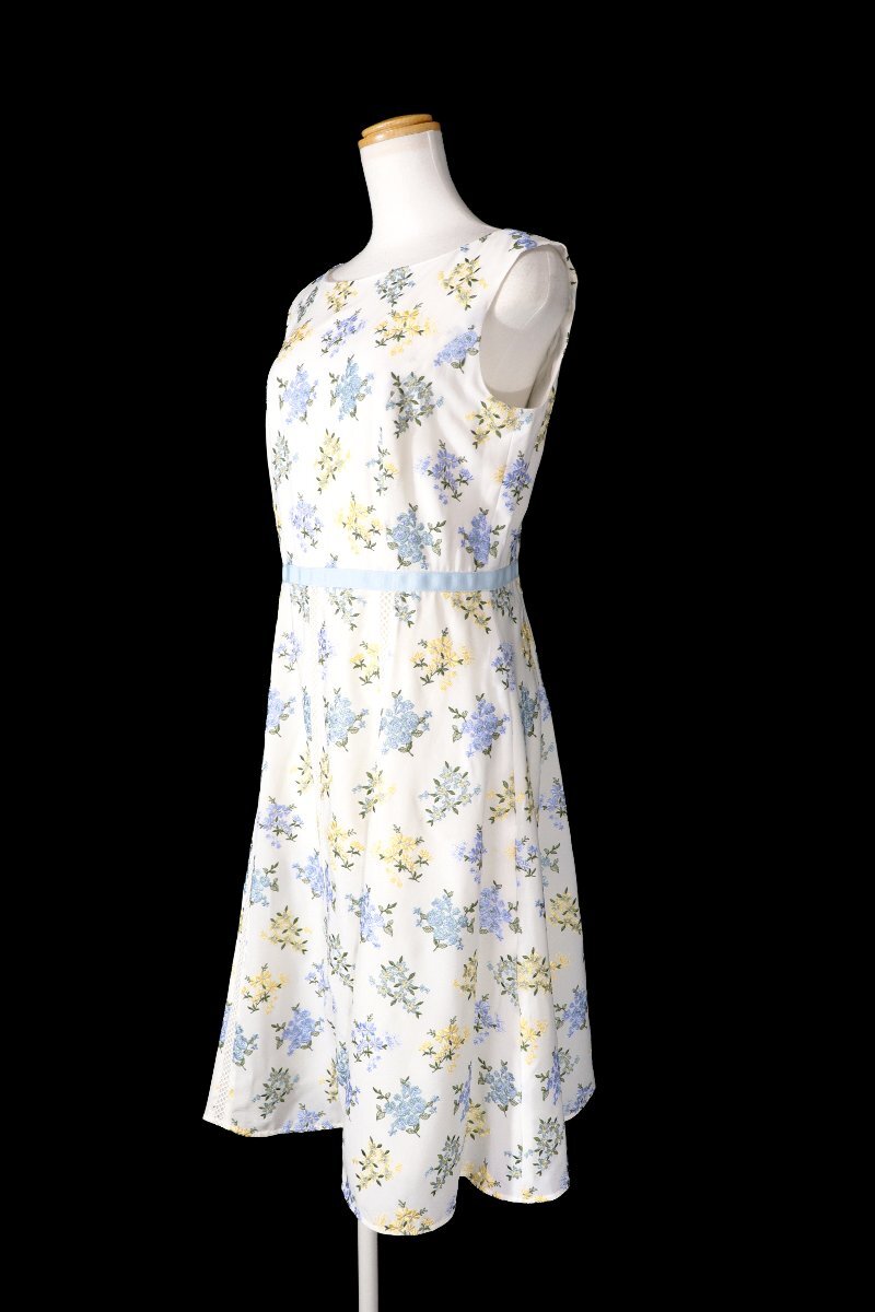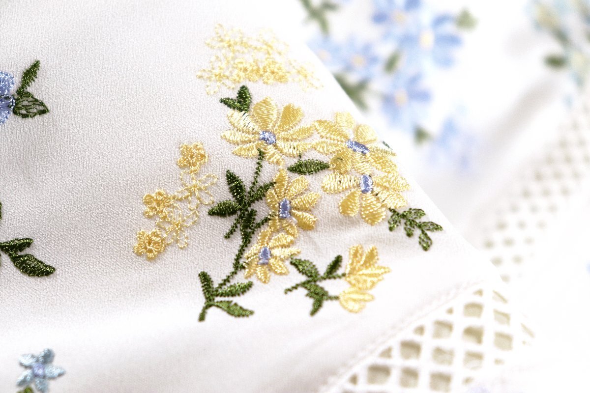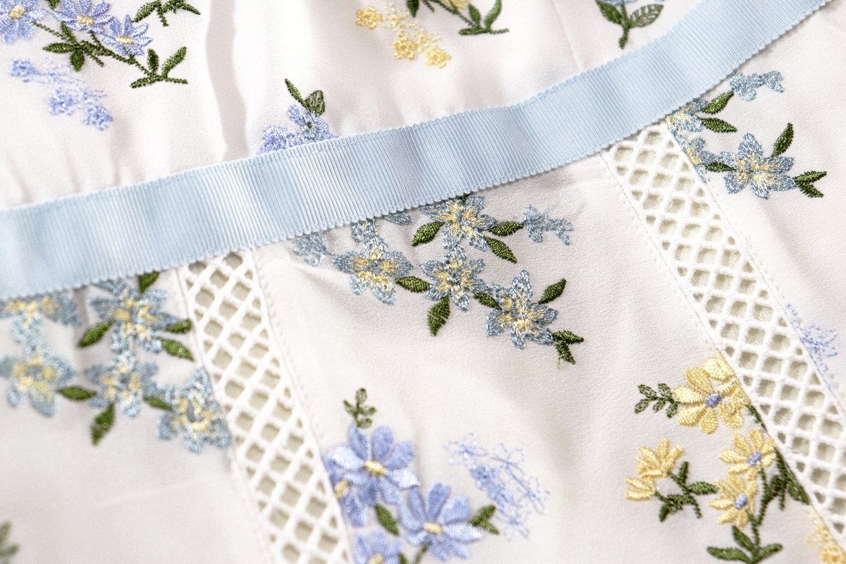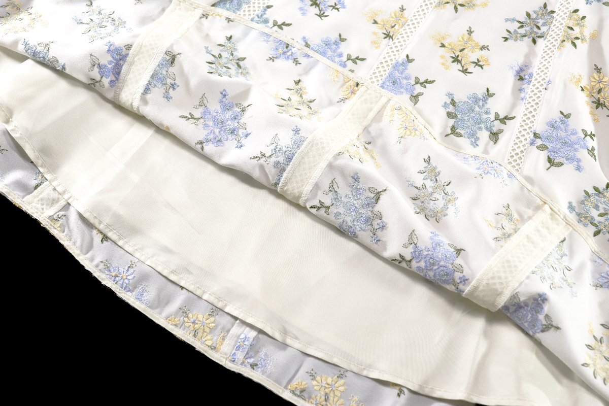 白地に爽やかな配色の花柄刺繍を乗せたドレスです。