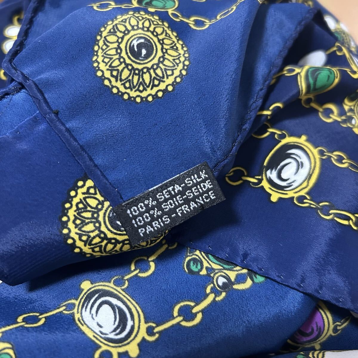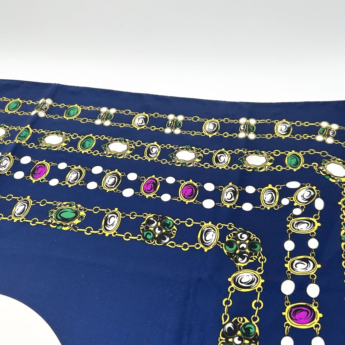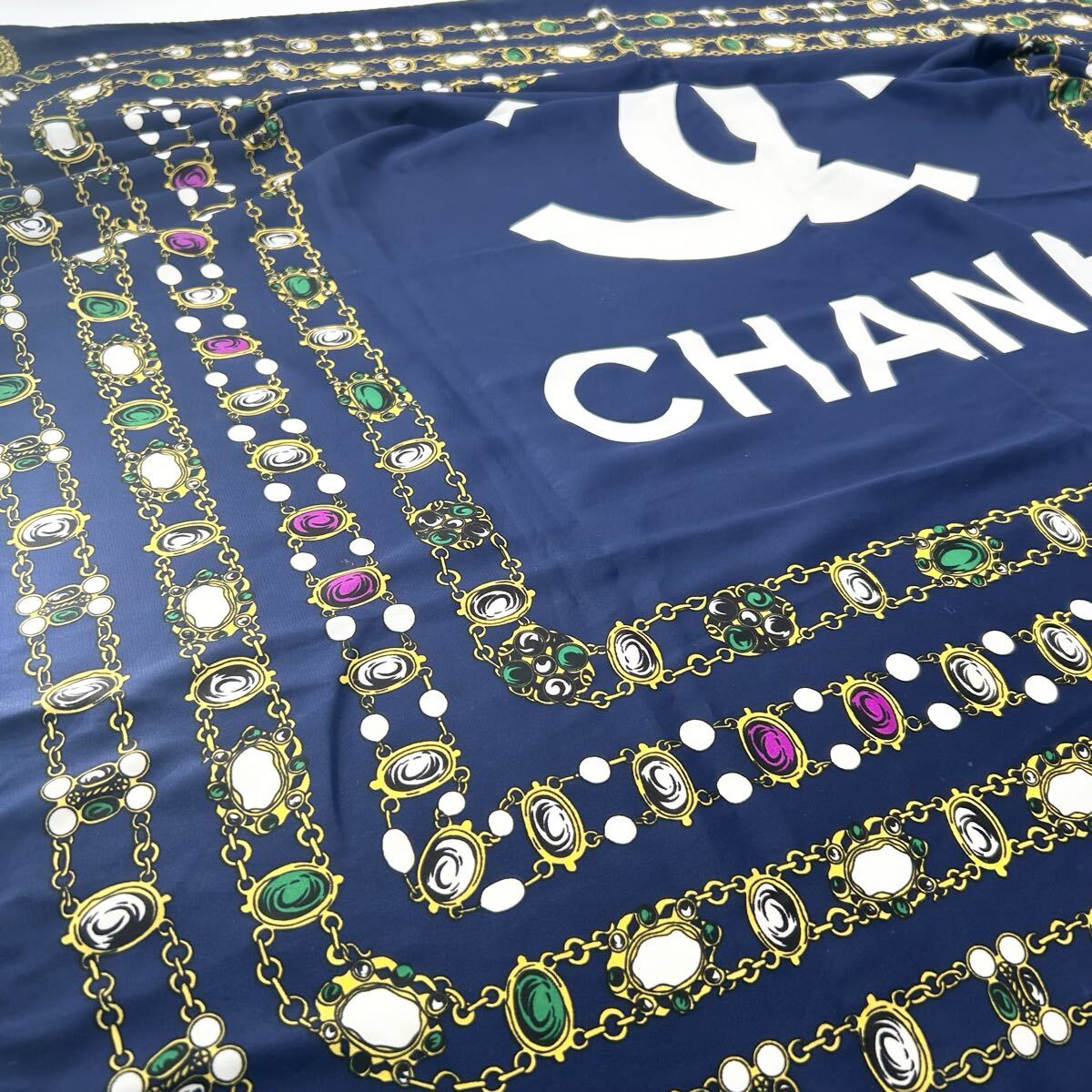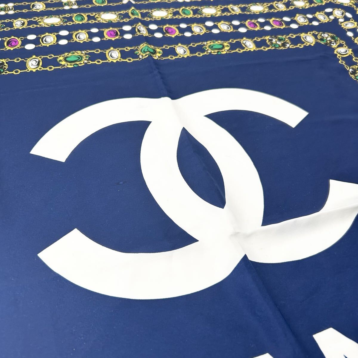 良品!!タグあり◎CHANEL シャネル スカーフ ココマーク ビッグロゴ 宝石 チェーン柄 ネイビー ロゴ 大判 シルク100% 絹 シルク
