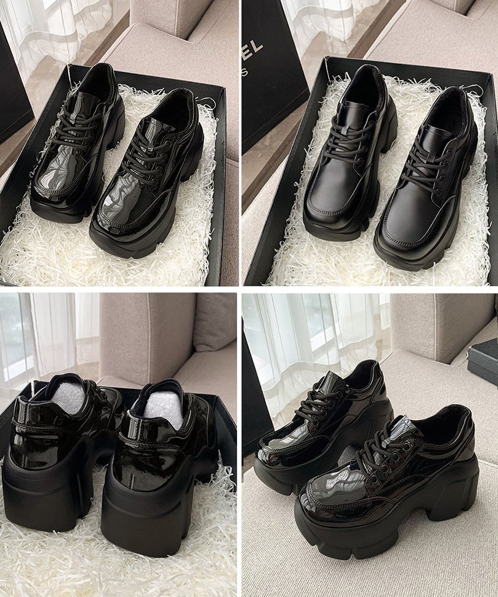 レディース ドレスシューズ 美脚脚長 ボリュームソール 歩きやすい 合皮厚底靴 編み上げ レザー調カジュアル 厚底5cm