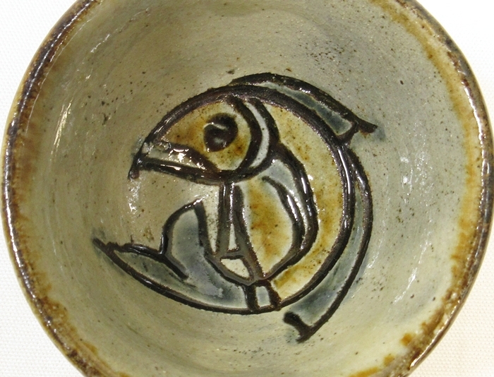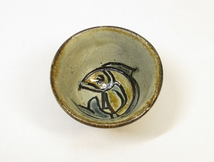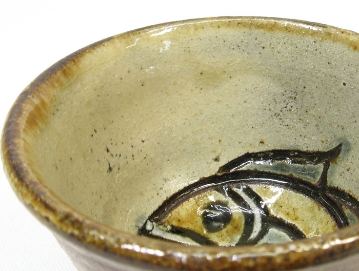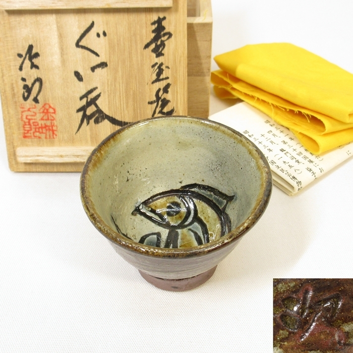 【B0684】酒器 壺屋焼 人間国宝【 金城 次郎 】造 ぐい呑み 魚文 盃 民藝 沖縄 琉球 共箱 栞付き 即決