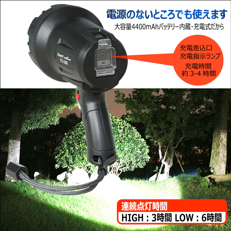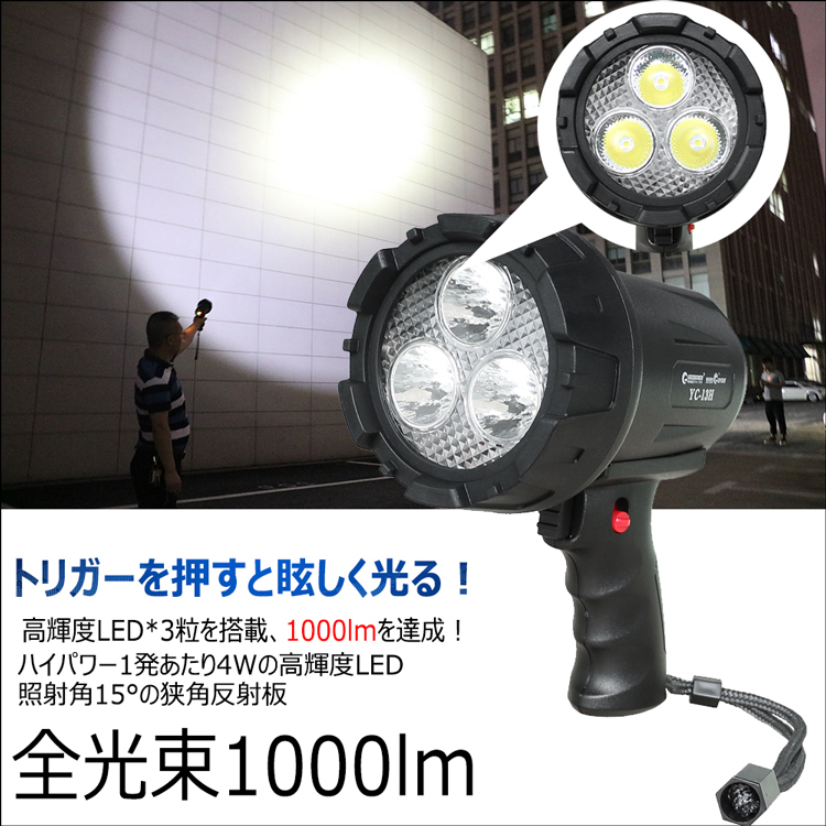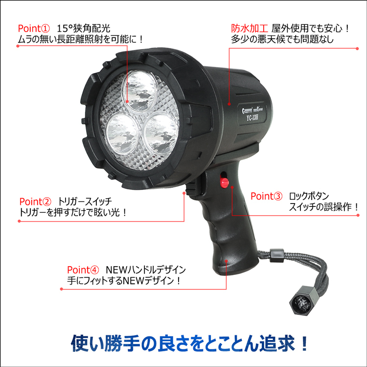 | ★オススメポイント★ ●15°狭角配光:900m超遠距離照射を実現 ●トリガースイッチで点灯3モードを切り替え ●ロック機能付き:誤点灯・誤消灯を防止 ●IP65防水加工:屋外でも利用可能 ●持ちやすく操作がしやすいガンタイプ ●充電式・コードレス:電源のないところでも安心に使える |