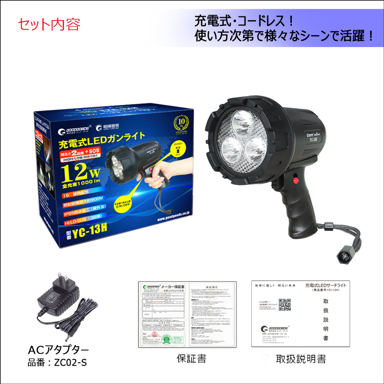 | セット内容 | サーチライト本体(ストラップ付属)、AC充電器(ZC02-S)、保証書、取扱説明書 | ||