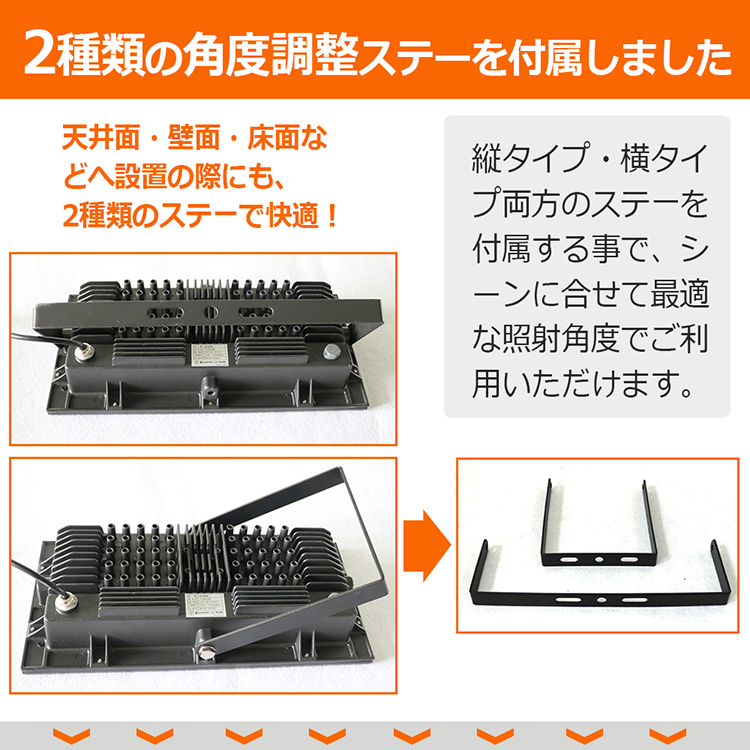 ★オススメポイント★ 放熱性・防水性能に優れた高輝度・省エネの100w LED投光器です。 これ一台で闇夜も真昼の明るさに!細かな作業も可能な強烈な明るさをご提供致します。 看板や屋内・屋外イベント・店舗の常設用として最適! 【高輝度の14000LM!新商品の省エネLED投光器】 200個の超高輝度SMD 5730を均一に並べたLED基盤。 6000~6500Kの色温度。 約120度の広範囲を照射。 約14000ルーメンの圧倒的な明るさを実現し、同等品より30%明るさアップ!! 【2種類のステーで最適な照射角度を実現!】 縦・横両方に設置可能な2種のステーを付属しました。 照射面を水平に変更したり、縦に変更したりと用途に応じてご選択頂けます。 壁掛け・床付け・天井などの取り付けに対応できます。 しかもステーは180度調整可能で様々なシーンにご利用頂けます。 【熱発散が速い 長寿命】 ヒートシンクを採用し安定した温度に保ちます。 従来品より更に優れた放熱性で効果的に寿命を延ばします! 【密封性に優れ、IP66等級の防水性能を】 コーキングを強化することで、IP66相当の防塵・防水性能を実現! IP66防水レベルで、室外や室内の照明と広告看板、掲示板など様々な場所でご利用頂けます。 倉庫・作業場・安全照明としても最適です! 【平均演色評価数Ra80以上!】 高輝度LED素子を搭載し、自然に近い純粋な色味を再現。 優れた演色性によりひときわ明るく、対象物の本来の色味を損ないません。 【優れた堅牢性!耐衝撃、耐振動】 耐衝撃、耐振動、丈夫な設計で安全性・安定性・信頼性抜群 作業場で求められる強靱なボディを備え、高い堅牢性を提供します。 【AC85~265Vの電圧に対応!】 電圧はAC85~265Vの広範囲で利用可能! 電圧の心配なくあらゆる国・場所で快適にご利用いただけます。 【新設計の薄型ボディで従来品より更に設置場所が広がります!】 海苔漁・シラス漁での常夜灯。夜釣りの照明。集魚灯などさまざまな場面で活躍! 看板灯、駐車場灯、インテリア照明・ 樹木や店舗壁面などのライトアップ照明に!看板照明や店内の演出用照明! 公共場所、駐車場、事務所、展示場に使用、作業灯 駐車場灯、看板灯、街灯、公園、ホール、玄関常夜灯、町内防犯灯として使用! 一定の明るさが必要とされる検品作業を行う際の照明や、 夜間作業を行う際の照明など様々な場面で活用頂けます。 屋外用照明としてもご利用頂けます |